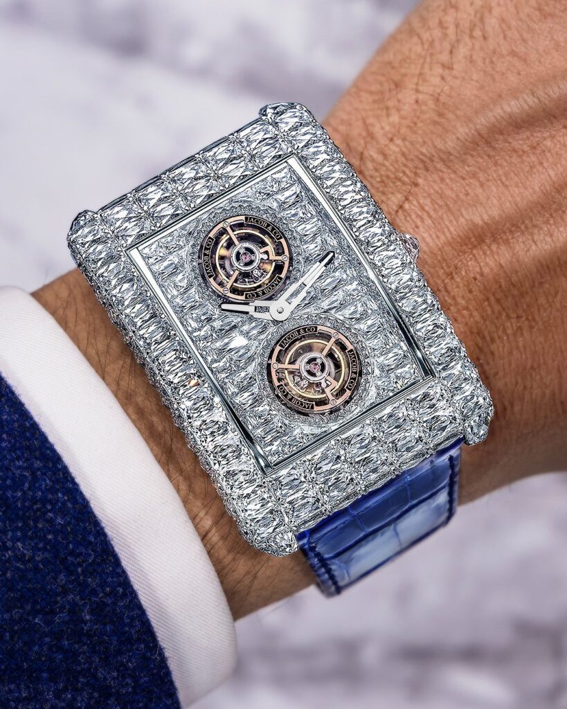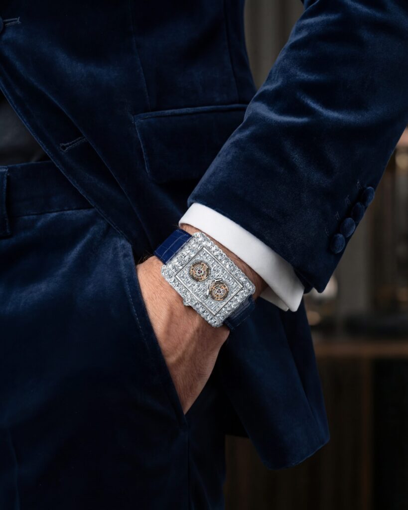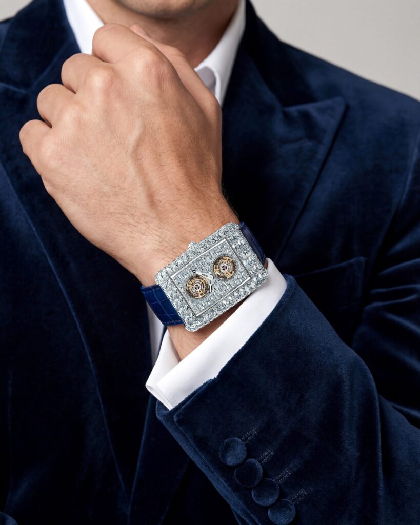 El debut mundial de esta patente se ha dado en el Billionaire Double Tourbillon Angel Cut, el primer guardatiempo de la historia engastado con estos diamantes. Su imponente caja de oro blanco de 54 x 41 mm está iluminada por 98 diamantes Angel Cut que suman aproximadamente 51,13 quilates. El diseño continúa en la esfera con otros 88 diamantes Angel Cut y piedras en talla baguette, logrando una arquitectura de luz ininterrumpida que enmarca el mecanismo con total simetría. En conjunto, la pieza cuenta con 298 diamantes blancos que alcanzan un total cercano a los 79 quilates.