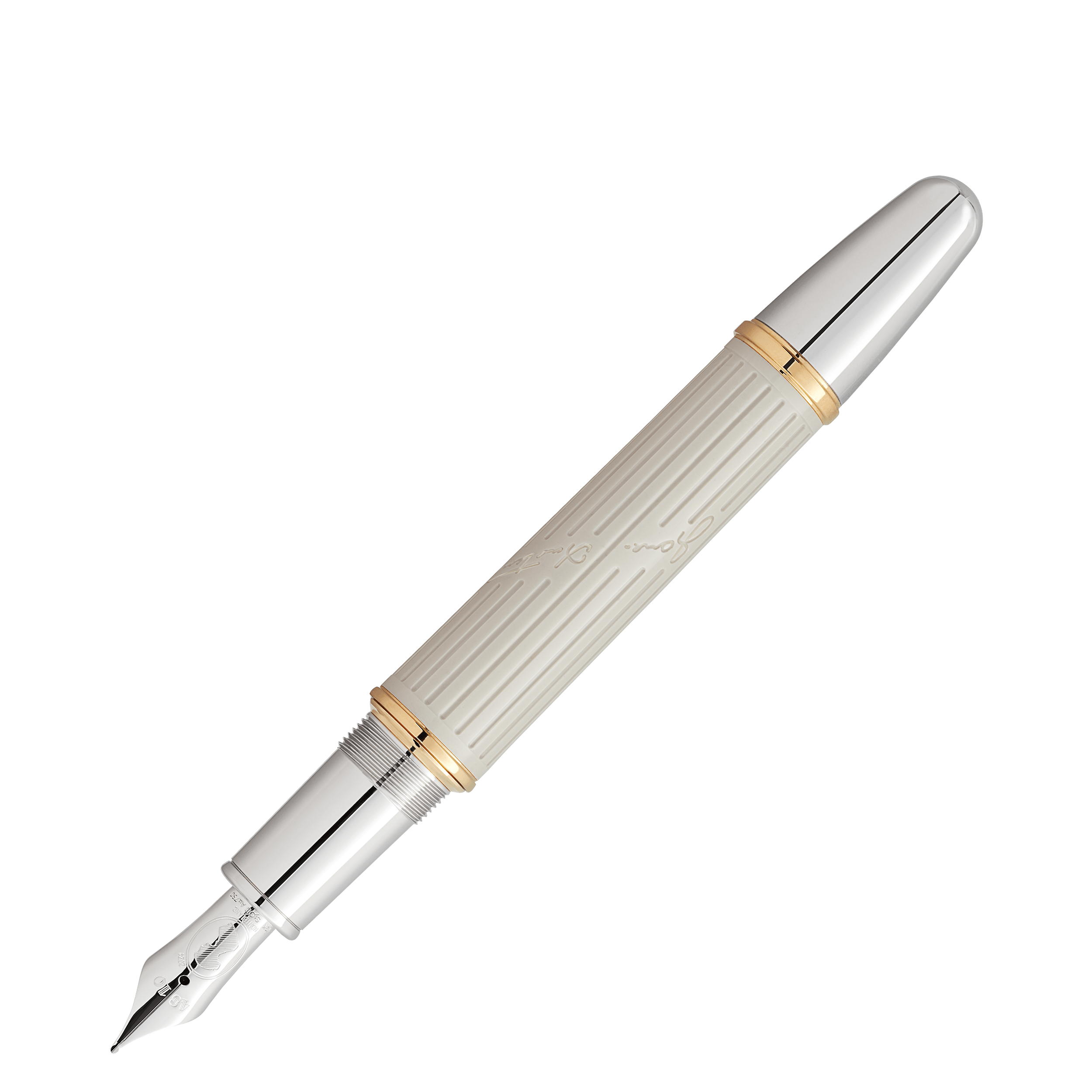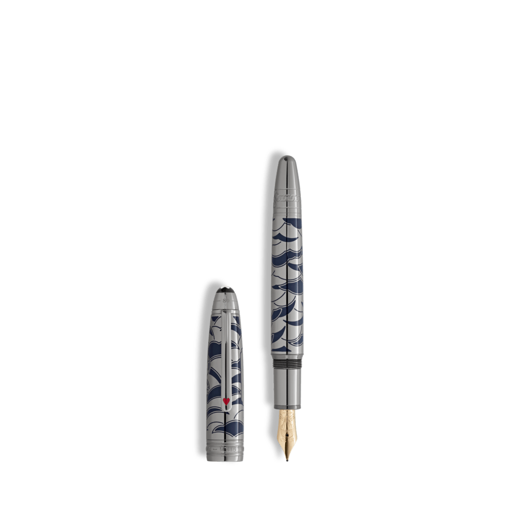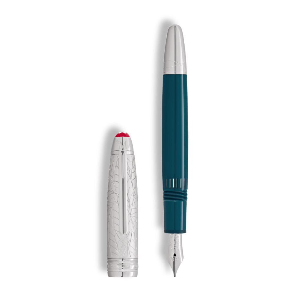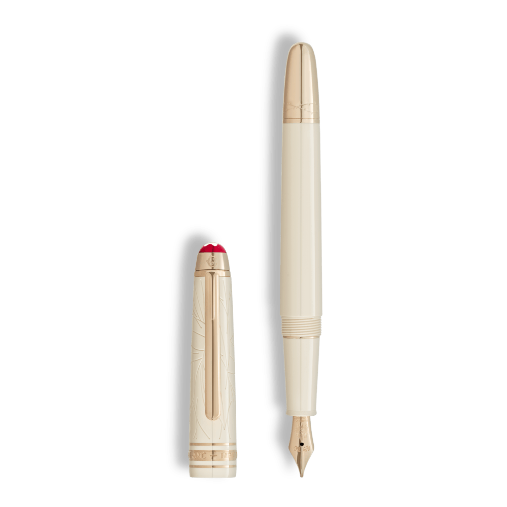CAPUCHÓN Resina preciosa negra con emblema Montblanc incrustado CLIP Acabado platinado DEPÓSITO Resina preciosa negra SISTEMA DE ESCRITURA Pluma Fuente PLUMÍN Plumín artesanal de oro de 18 K con incrustación rodiada