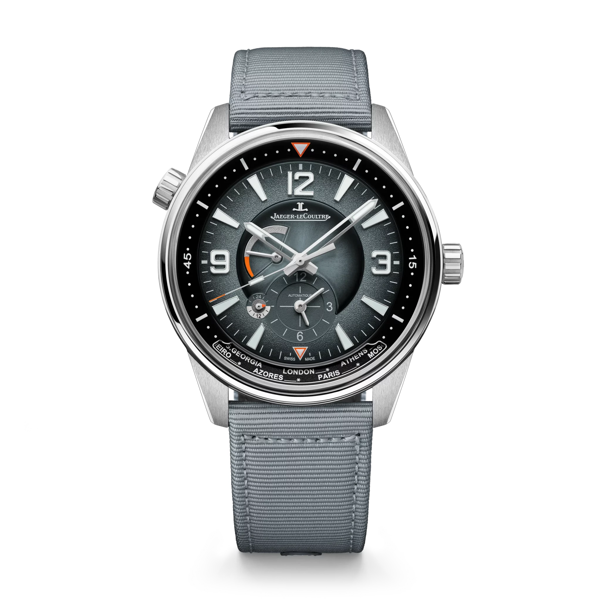 Polaris Geographic offers dual time display thanks to its highly legible world time disc. In an aperture located At 6 o’clock, the desired city is selected using a single crown at 10 o’clock, allowing automatic time setting on the small second time zone dial at 6 o’clock. In a double gradation, from the most From dark to light, the ocean grey dial radiates depth, enhanced by a triple opaline, grained and sunray finish. This hypnotic decoration highlights every attribute of the watch: luminescent hands, numerals and indexes, orange details… Offered with a duo of interchangeable straps in black rubber and blue-grey fabric, the Polaris Geographic houses the manufacture calibre 939. , which offers 70 hours of power reserve.