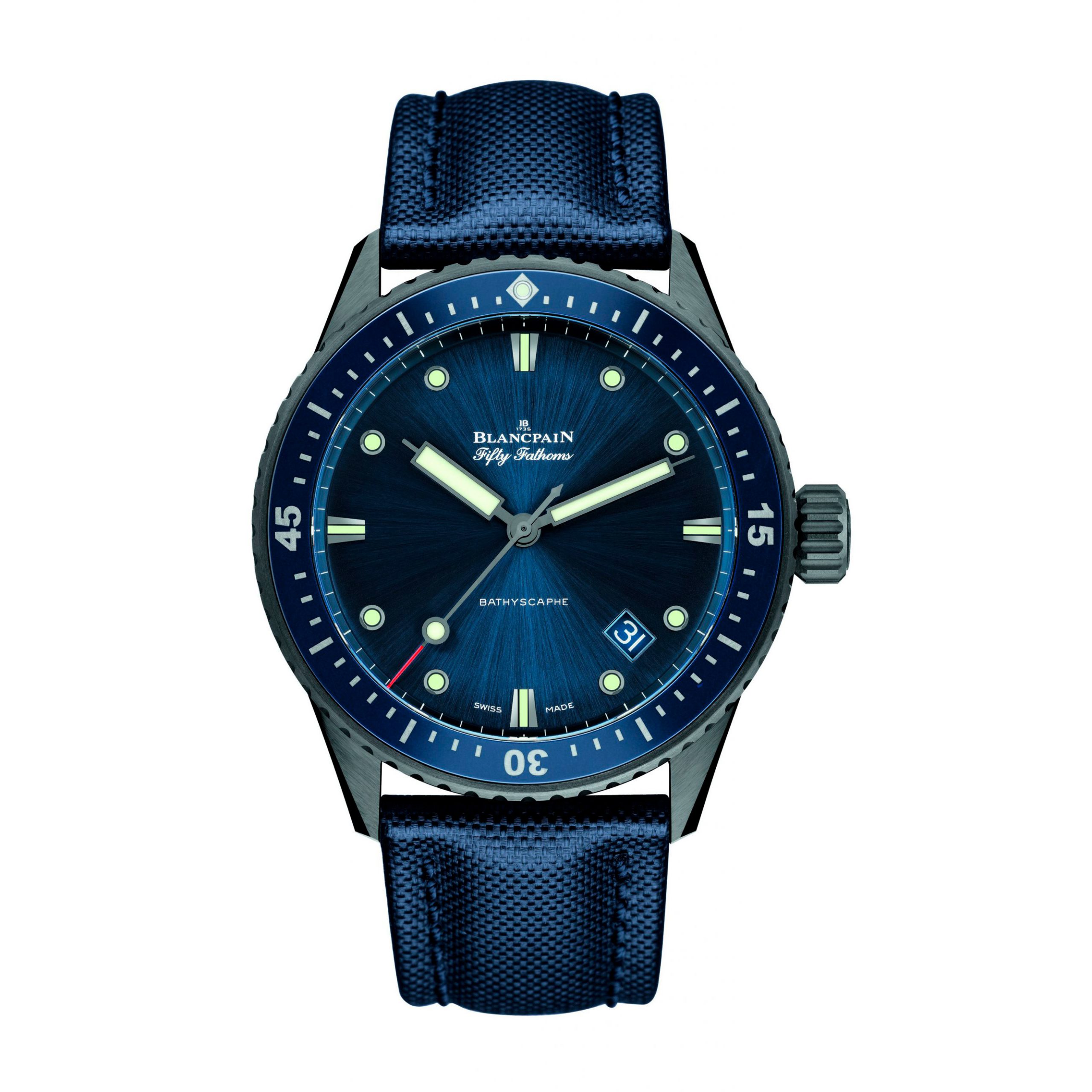 “Reloj Fifty Fathoms Bathyscaphe, automático, caja cerámica gris satinada, esfera azul, fondo de zafiro, indicador de fecha. Diámetro 43.60 mm. Reserva de marcha 120h. Espiral de silicio, bisel unidireccional de cerámica azul satinada con inserción de cerámica e índices Liquidmetal® movimiento con sistema de seguridad. Brazalete de tela de vela color azul. Estanquidad 30 bar (300 m), frecuencia 4hz. Ancho de caja: 13.80 mm. Calibre:1315.