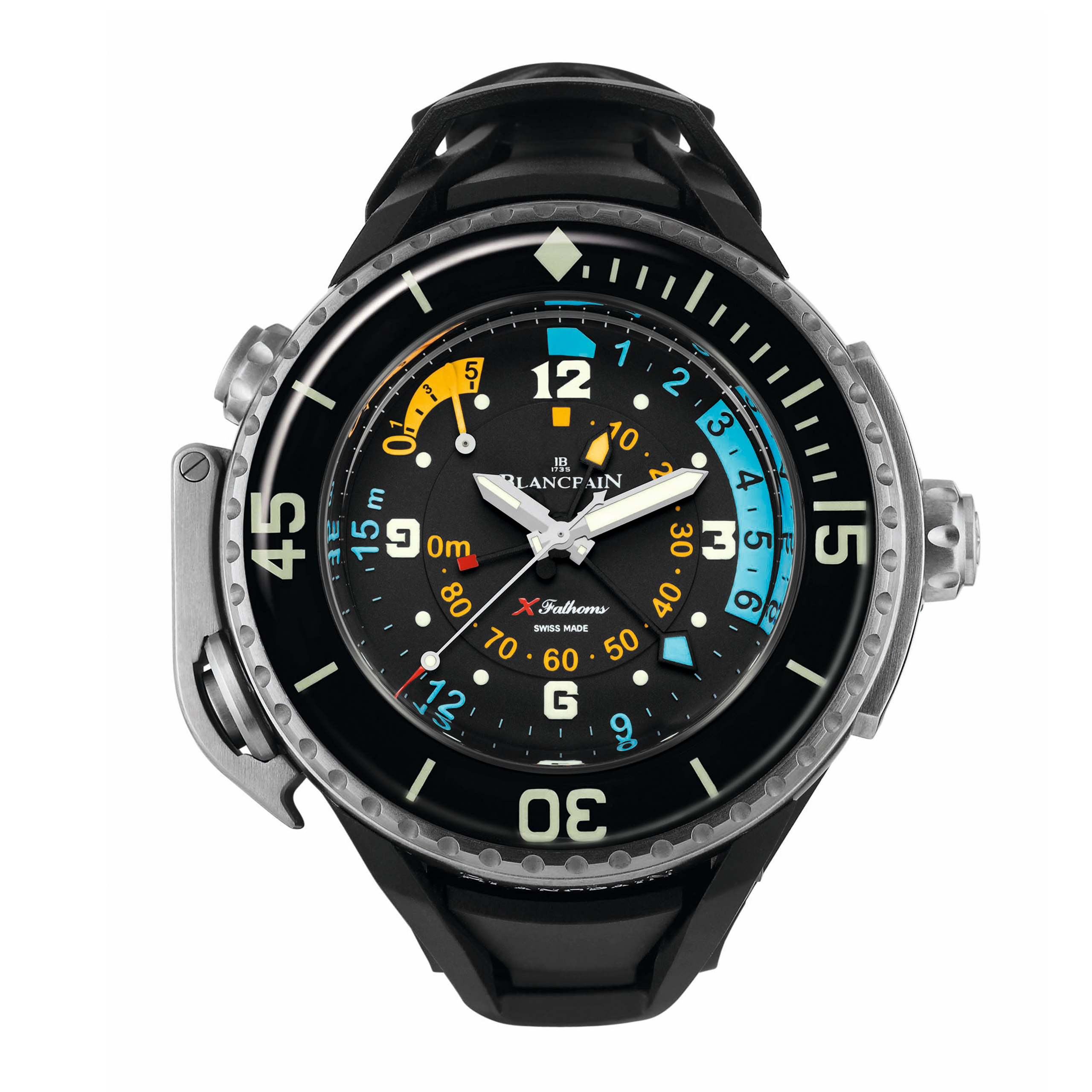 Reloj Fifty Fathoms, automático, caja de titanio, profundimetro, válvula de descompresión, indicador de la profundidad en dos escalas, memoria de profundidad máxima con pulsador de puesta de acero protegido, contador retrógrado de 5 minutos. Diámetro: 55.65 mm. Reserva de marcha: 120 h. Calibre: 8819B, espiral de silicio, membrana de metal amorfo, bisel unidireccional de zafiro movimiento con sistema de seguridad, esfera negra, Brazalete de caucho color negro, estanquidad: 30 bar (300 m), frecuencia: 4hz, ancho de caja: 24 mm.
