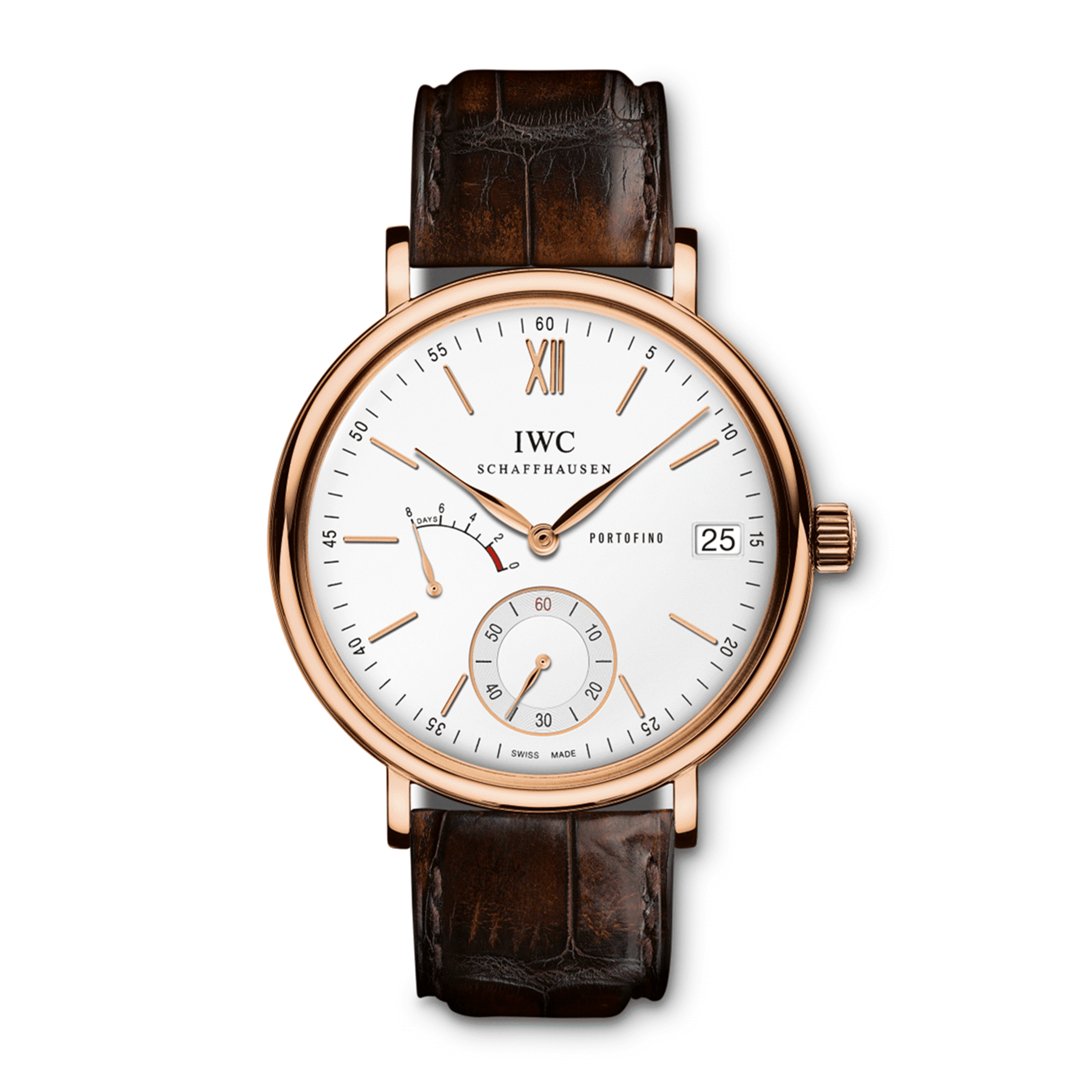 In the Portofino Hand-Wound Eight Days, the IWC-manufactured 59210-calibre movement will run precisely and reliably for a full 192 hours, or 8 days, before it automatically stops. Strictly speaking, it is 9 days, but the extra day in reserve ensures that the movement maintains as constant a driving torque as possible and continues to run precisely. The owner will always be on the safe side if he winds his watch once a week. The power remaining can be read off on the power reserve display on the dial. Together with the small seconds display and date display, this gives the dial a pleasing equilibrium. The indexless balance has a frequency of 28,800 beats per hour and, together with the Breguet spring bent into shape in accordance with age-old watchmaking tradition, helps to make the watch exceptionally accurate. The watch is available with an 18-carat 5N gold case, silver-plated dial and solid gold indices. It has a transparent sapphire-glass back and a dark brown alligator leather strap from the House of Santoni.
