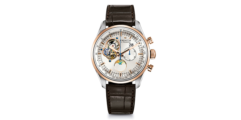 This chronograph is El Primero with date and moon complications. It presents a steel case with bezel and pink gold winder.