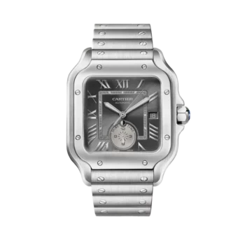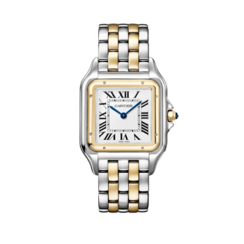 Ballon Bleu de Cartier watch, 42 mm. Self-winding mechanical movement, calibre 1847 MC. Steel case, 18-carat (750/1000) yellow gold fluted crown set with a cabochon-shaped synthetic spinel. Silver-coloured guilloché dial. Sword-shaped hands in blued steel. Sapphire crystal. Calendar aperture at 3 o’clock. Two-tone interchangeable strap. Thickness: 13 mm. Water-resistant to 3 bar (approx. 30 metres/100 feet).