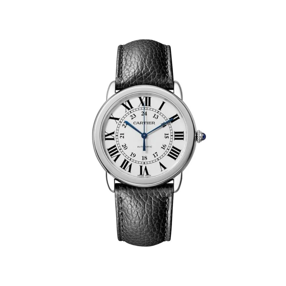 Ronde Solo de Cartier watch, 36 mm, self-winding mechanical movement. Stainless steel case, circular-grained steel crown decorated with a synthetic spinel cabochon. Silvered opaline dial. Sword-shaped blued steel hands. Sapphire crystal.