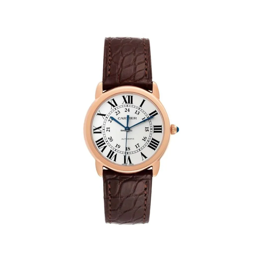 Ronde Solo de Cartier watch, 36 mm, quartz movement. Yellow gold case with steel case-back, yellow gold circular-grained crown decorated with a synthetic spinel cabochon. Silvered opaline dial, Roman and Arabic numerals. Sword-shaped blued steel hands. Sapphire crystal. Alligator leather strap with rounded scales and yellow gold buckle. Calendar aperture at 3 o’clock.
