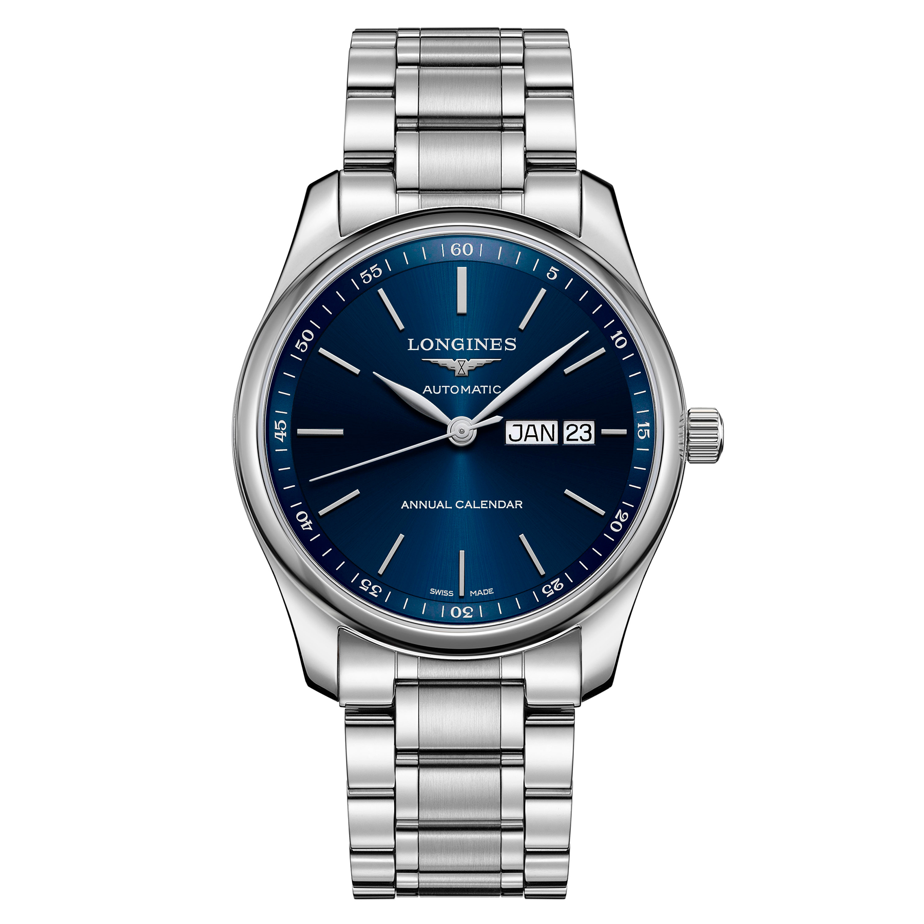 The Longines Master Collection is an emblem of the brand’s watchmaking know-how. Today’s man is multifaceted and always on the move, this piece will meet all his requirements, with a blue dial with a month and date window; Scratch resistant sapphire crystal.