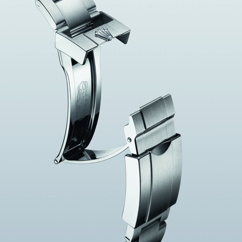 A paragon of robustness and reliability, the Air-King’s Oyster case is guaranteed waterproof to a depth of 100 metres (330 feet). The middle case is crafted from a solid block of Oystersteel, a particularly corrosion-resistant alloy. The Air-King is fitted on a three-piece link Oyster bracelet in Oystersteel. This bracelet is equipped with an Oysterlock safety clasp, designed and patented by Rolex, which prevents accidental opening. It is also fitted with the Easylink comfort extension link, which allows the wearer to adjust the bracelet length easily, by approximately 5 mm.