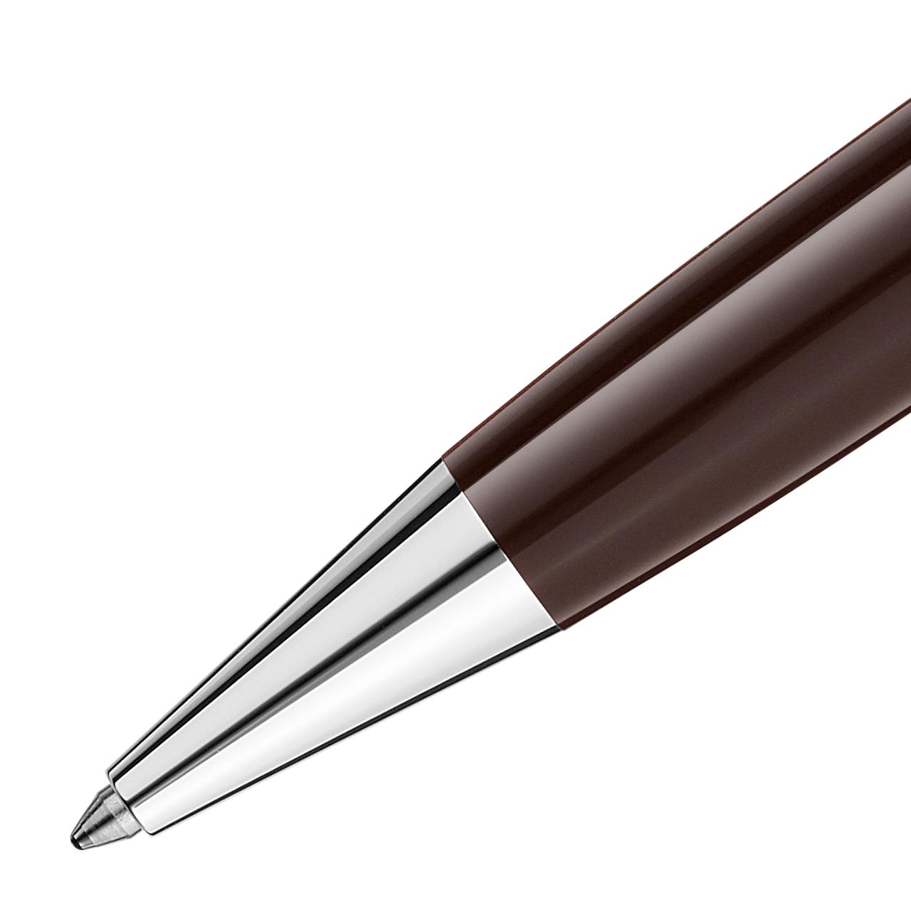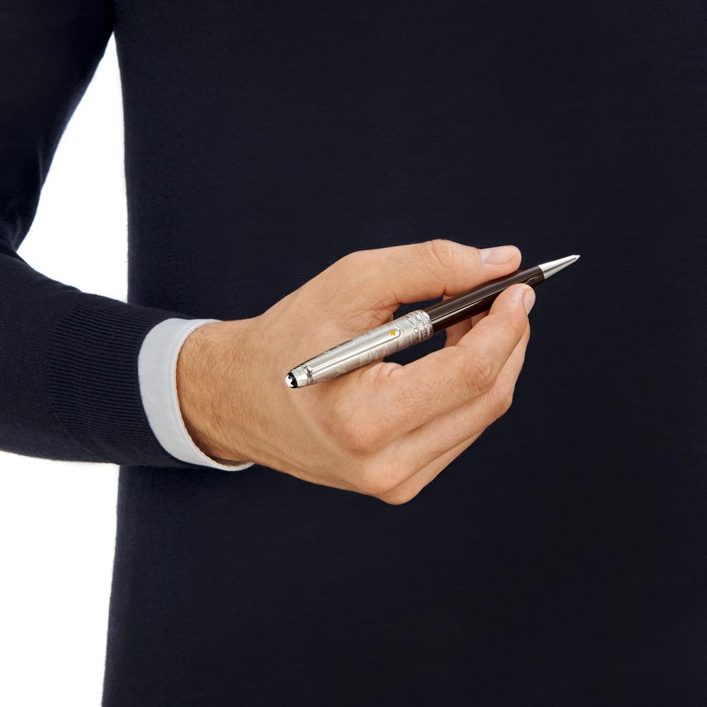 El rollerball Meisterstück Meisterstück Doué Classique Le Petit Prince con depósito de laca marrón oscuro evoca la forma aviador. El capuchón de metal platinado está realzado con un grabado del desierto y de un avión, luce una oración del libro El Principito y ostenta el icónico emblema en la parte superior. Tiene los tres anillos platinados, con la marca Montblanc grabada en el anillo central, y el clip es realzado por una estrella de laca amarilla.