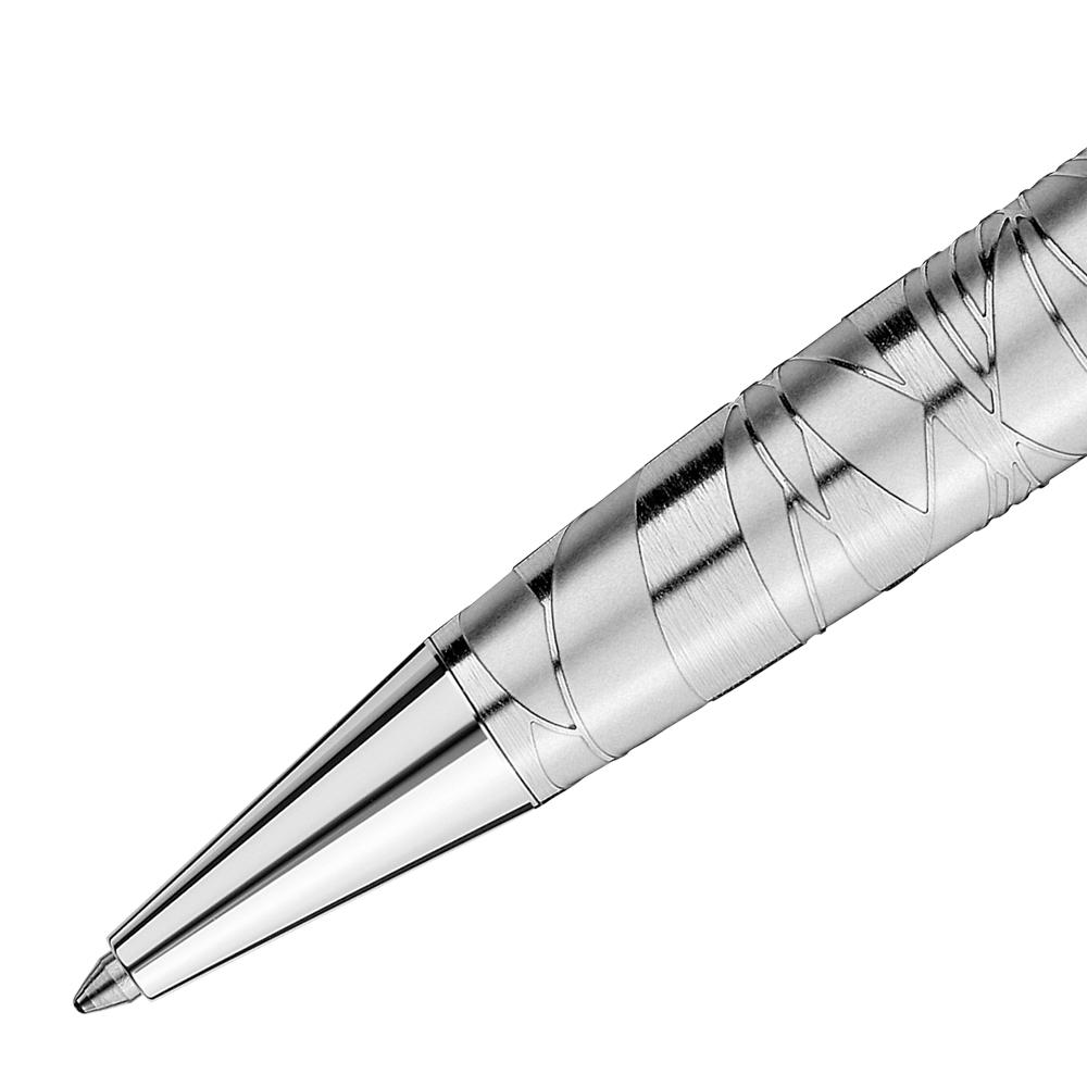 El bolígrafo Meisterstück Solitaire Doué Midsize Le Petit Prince luce un depósito de metal adornado con un motivo del desierto. El capuchón de piel marrón, adornado con un grabado del desierto y de un avión, luce una oración del libro El Principito y ostenta el icónico emblema en la parte superior. Tiene los tres anillos platinados, con la marca Montblanc grabada en el anillo central, y el clip es realzado por una estrella de laca amarilla.