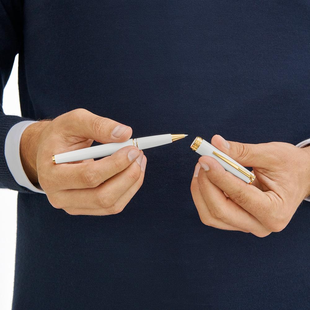 Este artículo de escritura, inspirado en el movimiento arquitectónico Bauhaus y bautizado en honor al histórico PIX, reúne diseño purista y facilidad de uso. Depósito y capuchón de resina preciosa blanca con elegantes detalles chapados en oro.