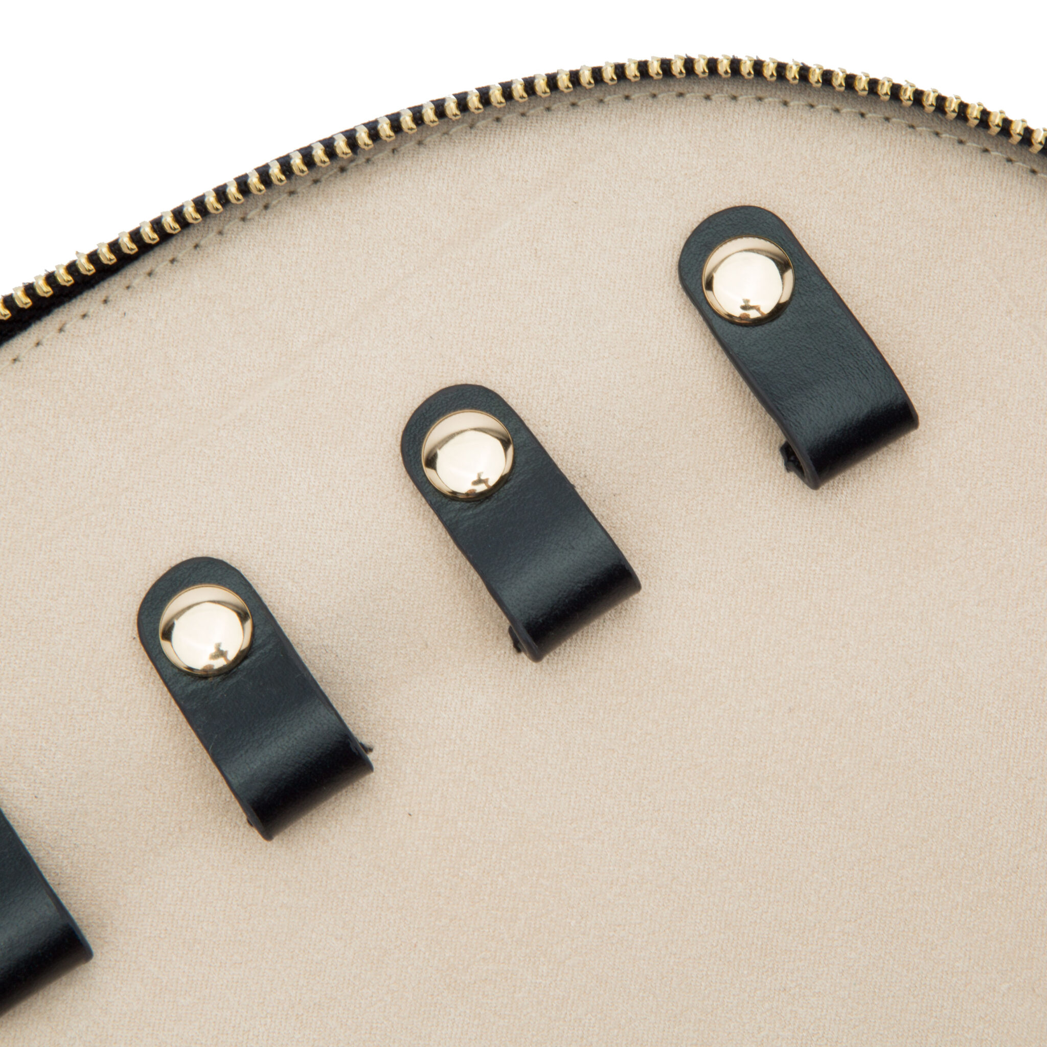 Almacenamiento: soporte para pendientes (2), rollo de anillos (2), bolsillo con cremallera mediano (1), bolsillo con cremallera grande (1), soporte para collares (4), espejo redondo extraíble (1)