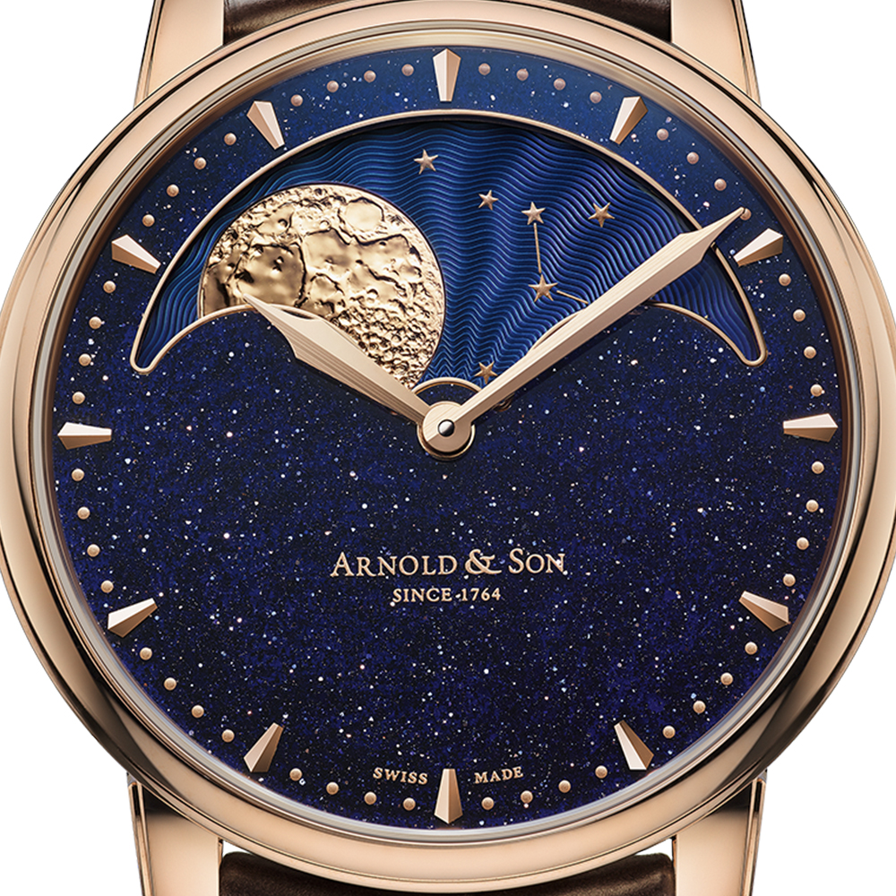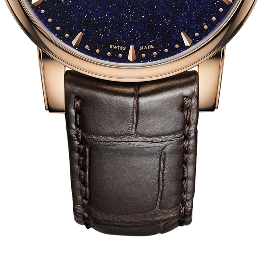 Perpetual Moon es la quintaesencia del refinamiento, con su rica variación de texturas y la generosa apertura de 29 mm de diámetro que se cierne sobre la esfera que alberga la brillante luna grabada en oro de 18 quilates que flota en un cielo estrellado nocturno azul guilloché.