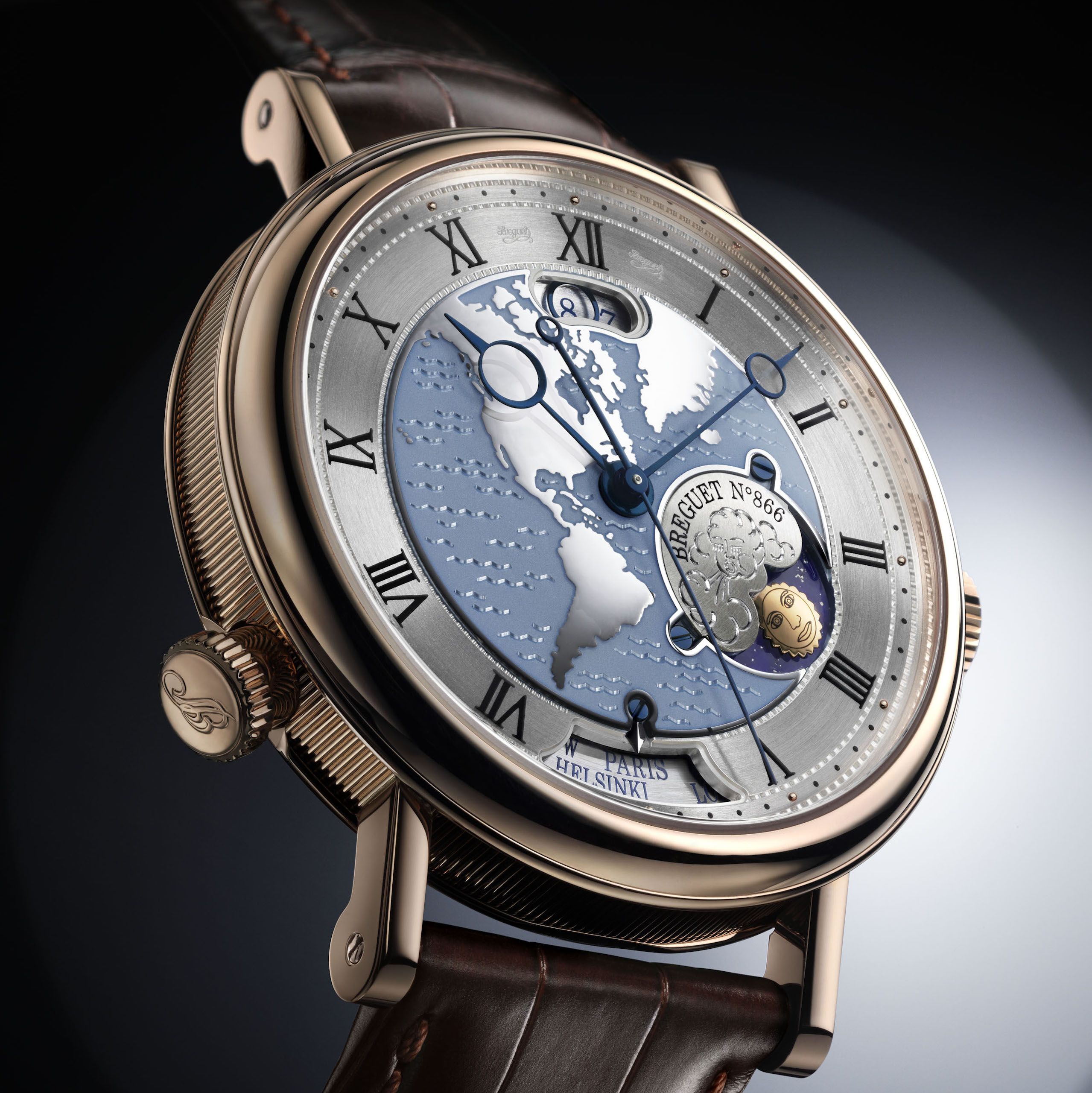 Reloj Classique “Hora Mundi”. Movimiento automático. Huso horario instantáneo con fecha, indicación día/noche y ciudad sincronizadas. Espiral, áncora y rueda de escape de silicio. Esfera de oro rosado con representación del continente americano y decoración guilloché realizada a mano, con motivos de “olas” bajo laca translúcida. Fondo de zafiro. Hermético hasta 3 bar ( 30 m ). Diámetro : 43 mm. Reserva de marcha de 55h. Calibre 77Fo. Frecuencia 4hz. Ancho de caja: 13.5 mm.