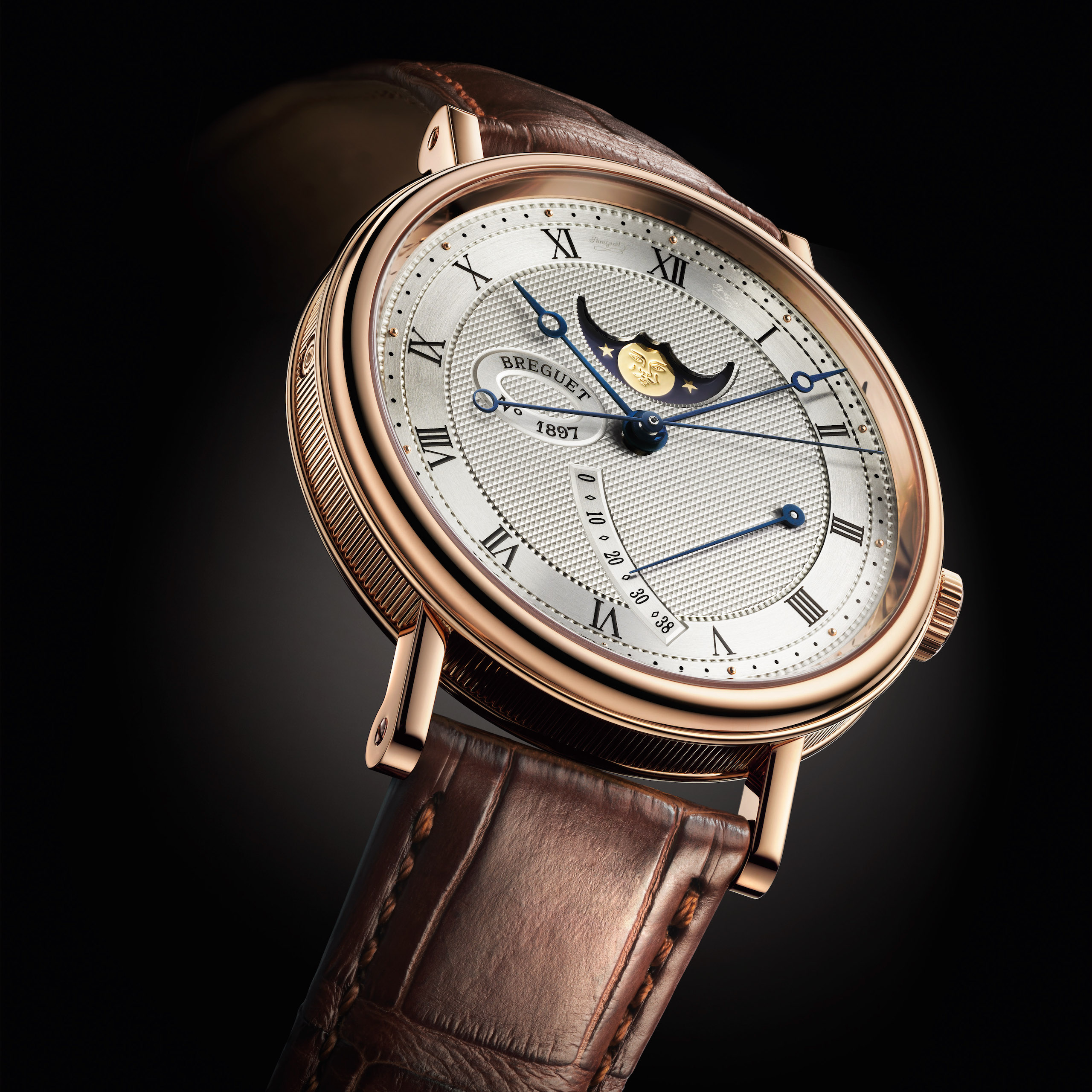 Reloj Classique automático de oro rosado, 18 quilates, diámetro 39mm, correa de piel de cocodrilo, color café y manecillas de hora y segundero. Indicador de las fases y edad lunar e indicador de reserva de marcha.