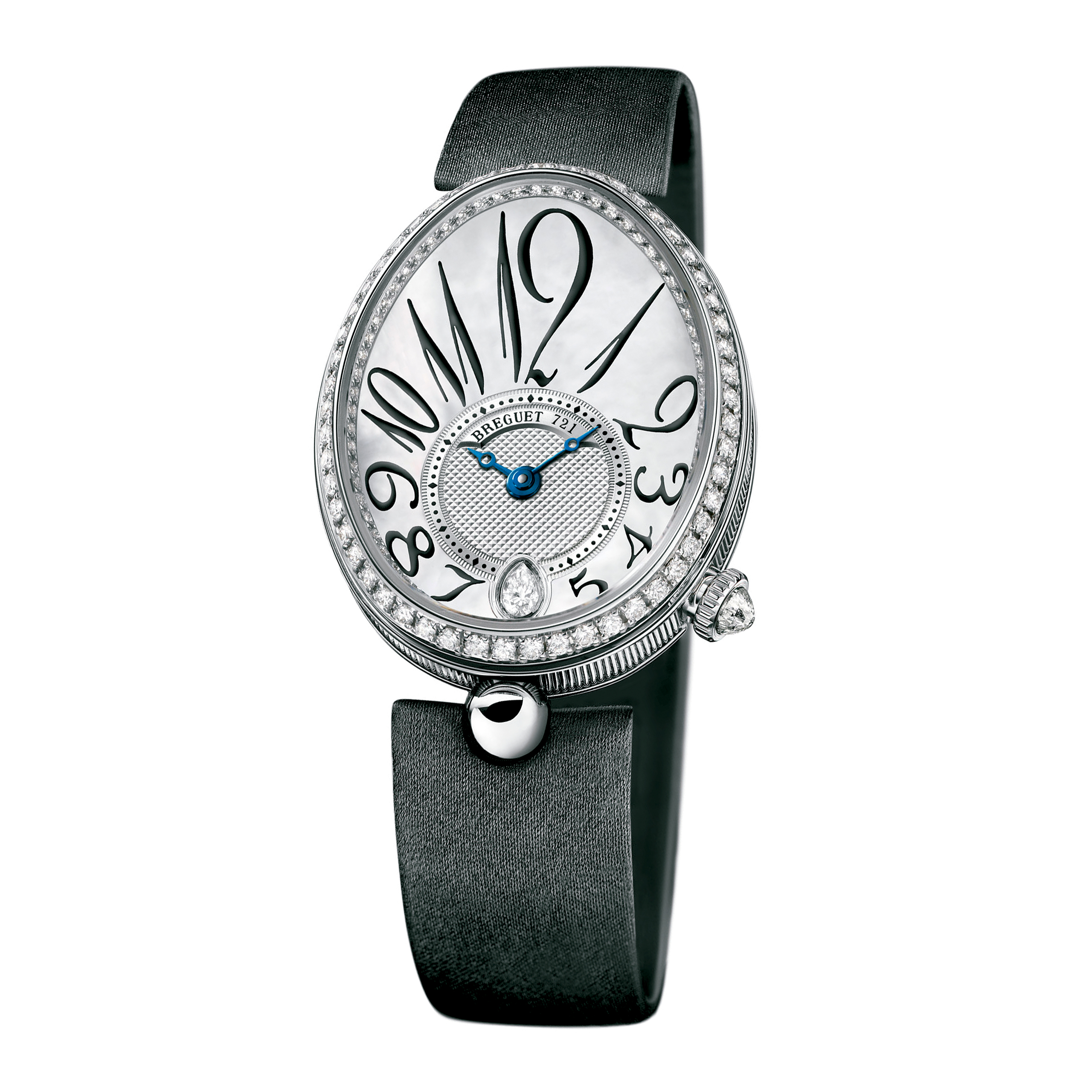Reloj Reina de Nápoles, caja de oro blanco, reserva de marcha 45 h, diámetro 36.5 x 28.45 mm, carátula descentrada.