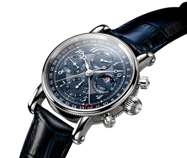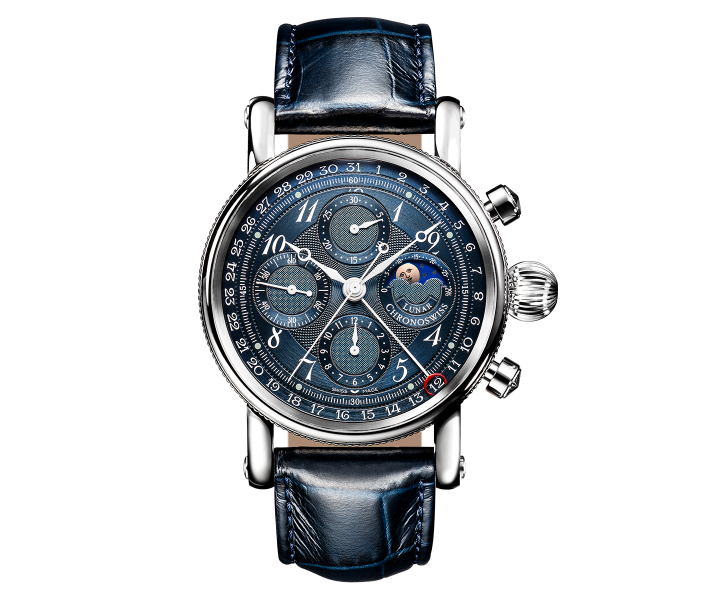 Horas y minutos centrales.Fechador alrededor. Cronógrafo con manecilla central. Contador de 30 min. a las 12 y de 12 horas a las 6. Pequeño segundero a las 9 y Edad de la luna a las 3. Carátula con guilloché central hecho a mano. Galvanizada azul marino.