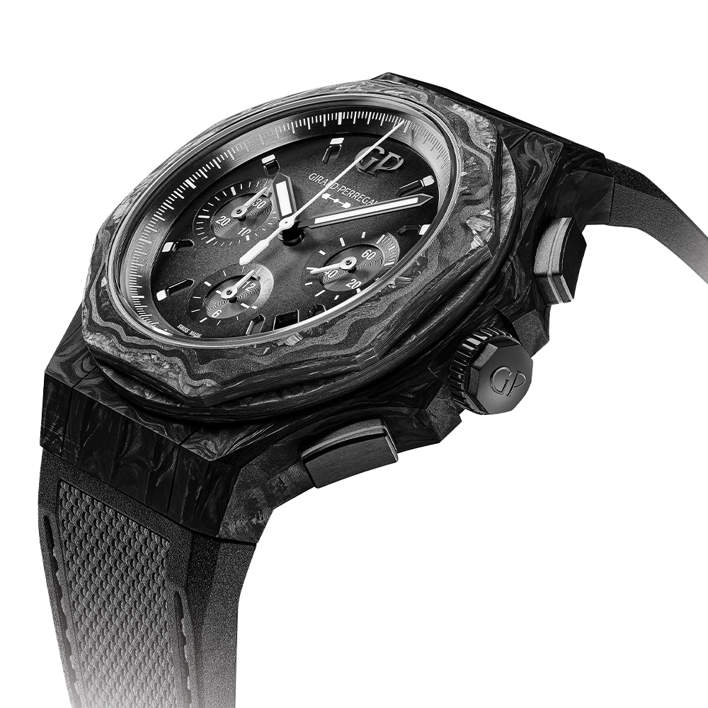 Este nuevo cronógrafo se presenta alojado en una caja de 44 mm de diámetro fabricada en cristal de carbono, un material muy fuerte y ligero. Tan ligero que el Laureato Absolute Crystal Rock solo pesa 94 gramos.