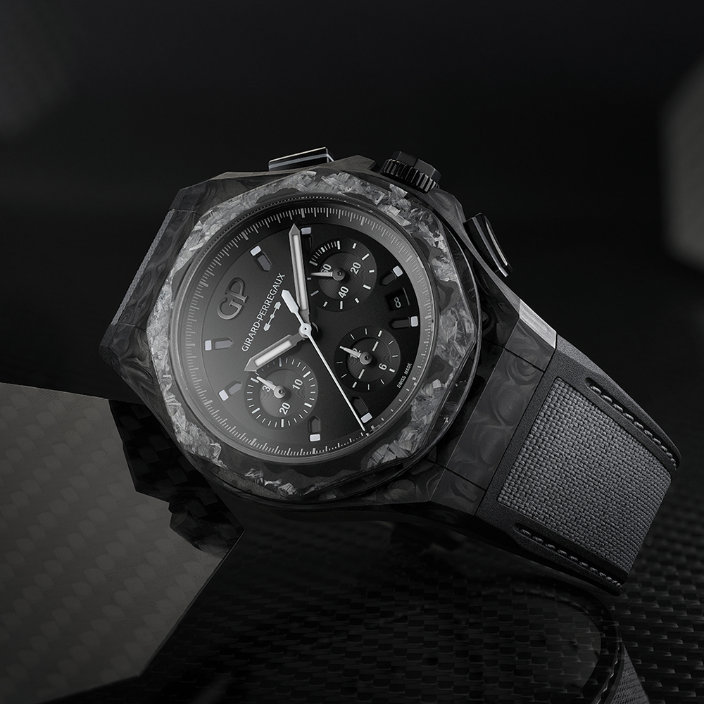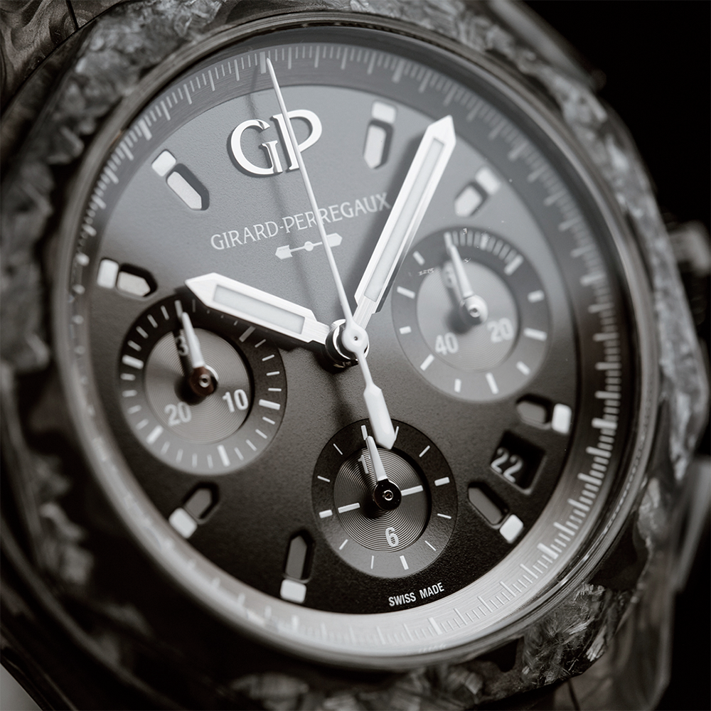 Measuring 44m in diameter, this new chronograph is housed in a case formed of Carbon Glass. Carbon Glass is strong and very light. Indeed, the Laureato Absolute Crystal Rock weighs just 94 grams.