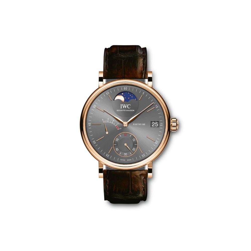 Este reloj de oro rosa de 18 quilates es un homenaje al primer Portofino de 1984.Equipado con el movimiento de cuerda manual calibre 59800, que cuenta con una reserva de marcha de 8 días con toda la cuerda dada. Cuenta con indicación de las fases de la luna.