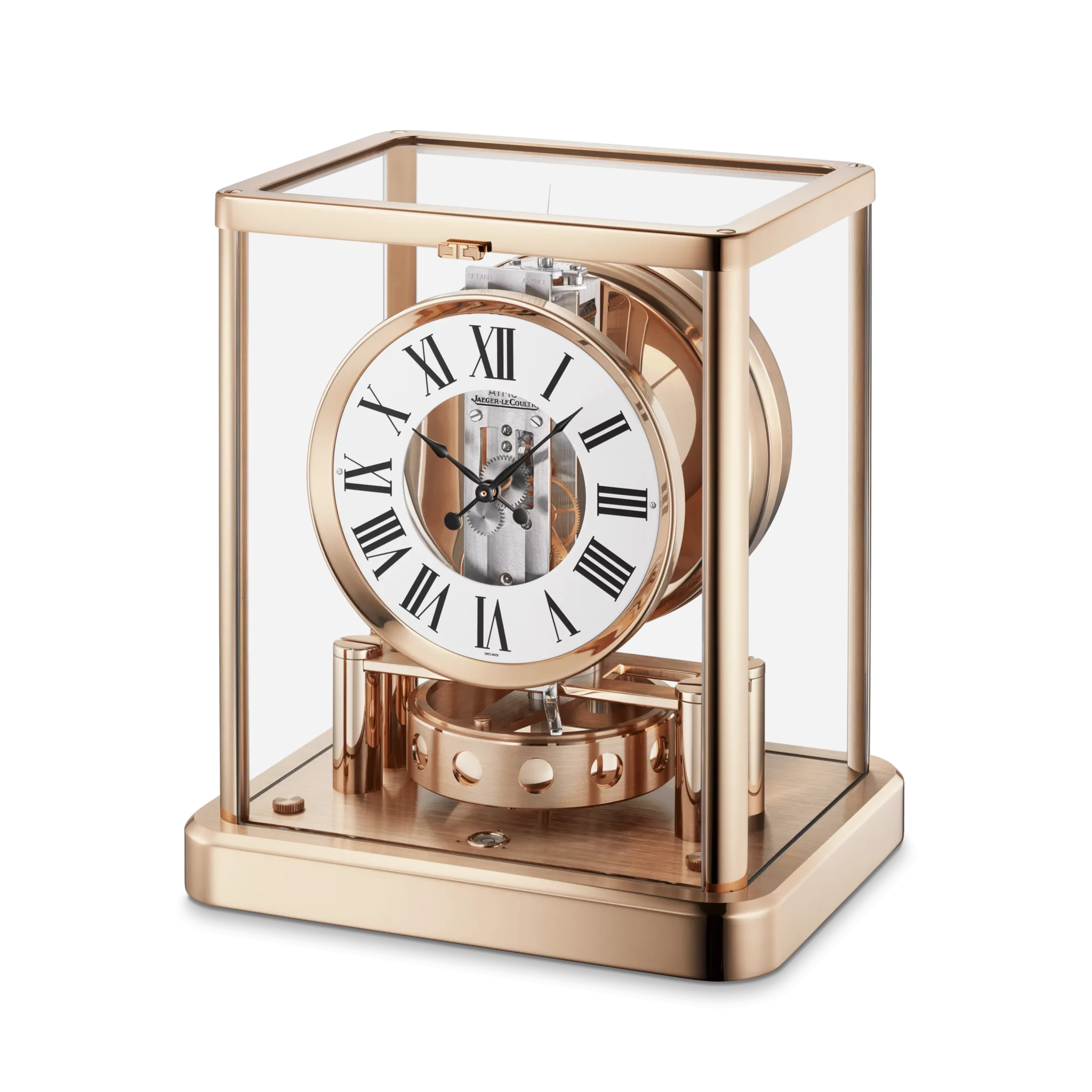 El Atmos Classique, un objeto atemporal, luce un gabinete en dorado rosa y una esfera pizarra para un aspecto más moderno. Este péndulo de excepción es perfecto para indicar el paso del tiempo en su casa.