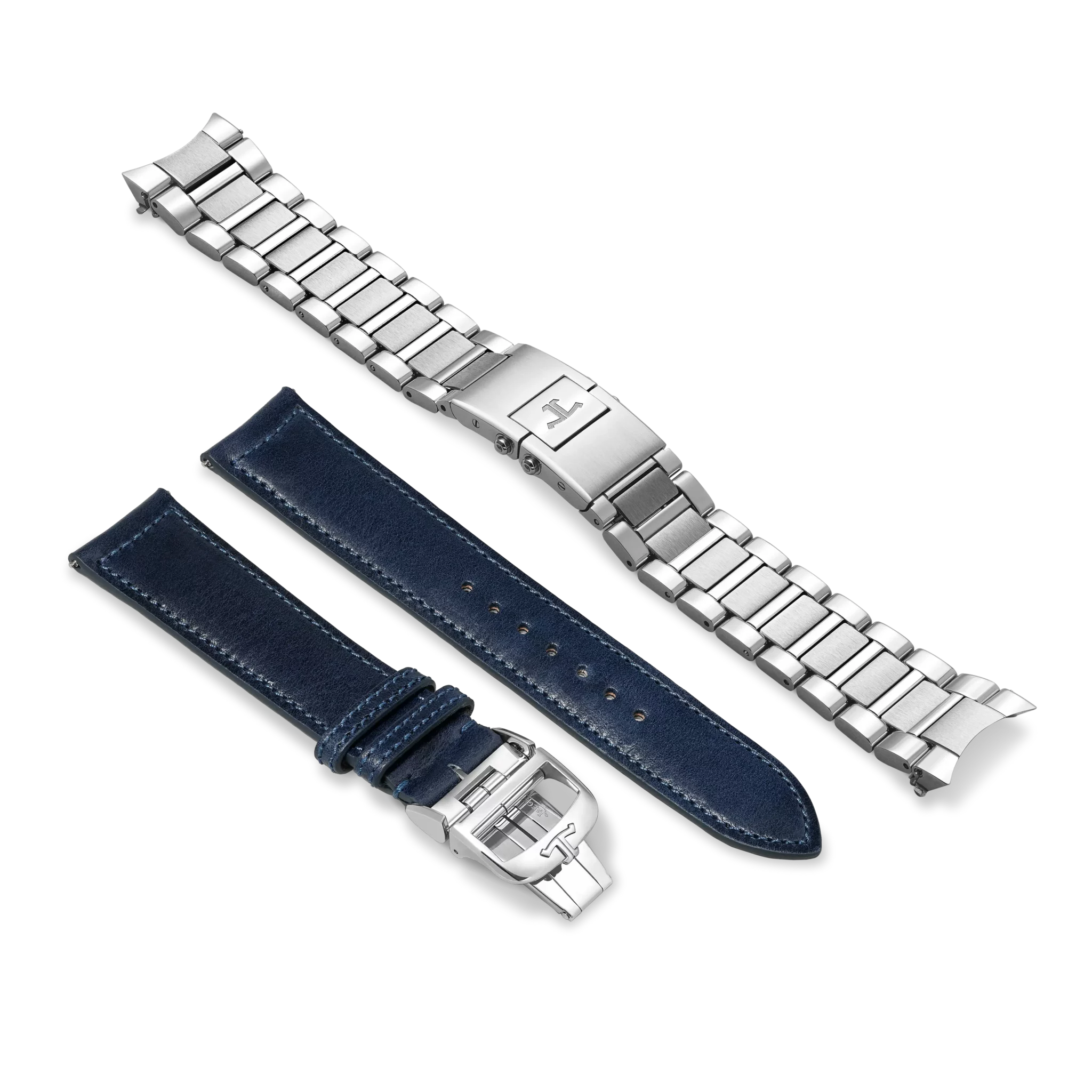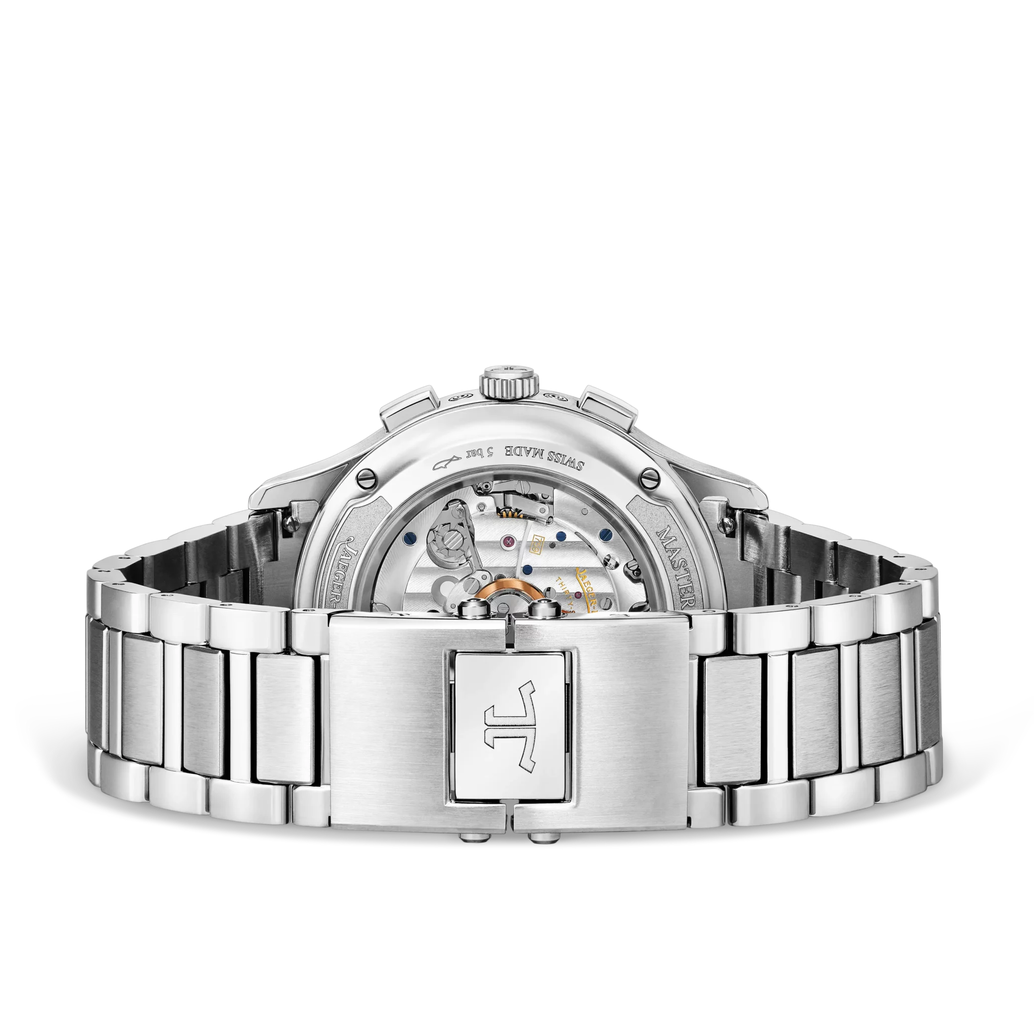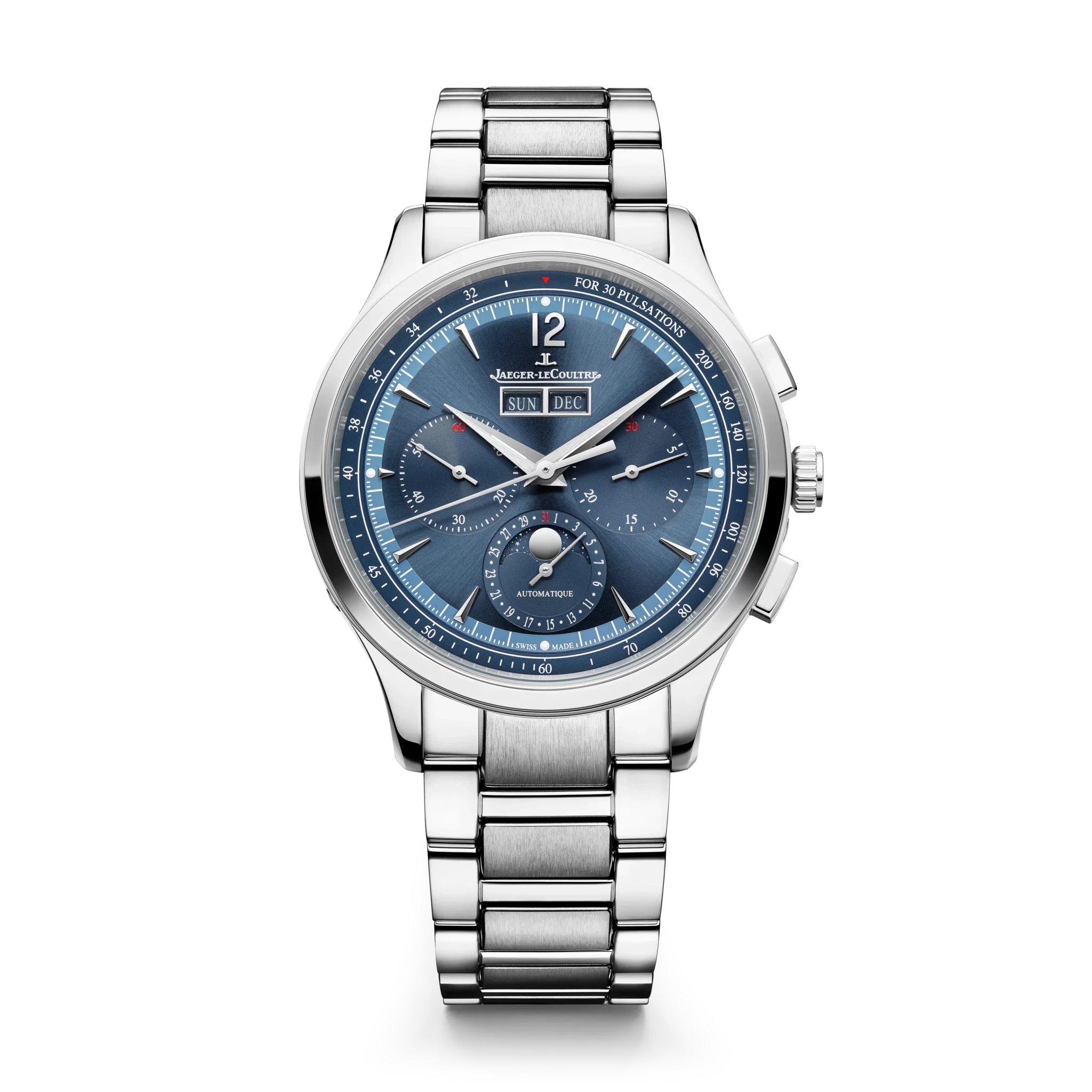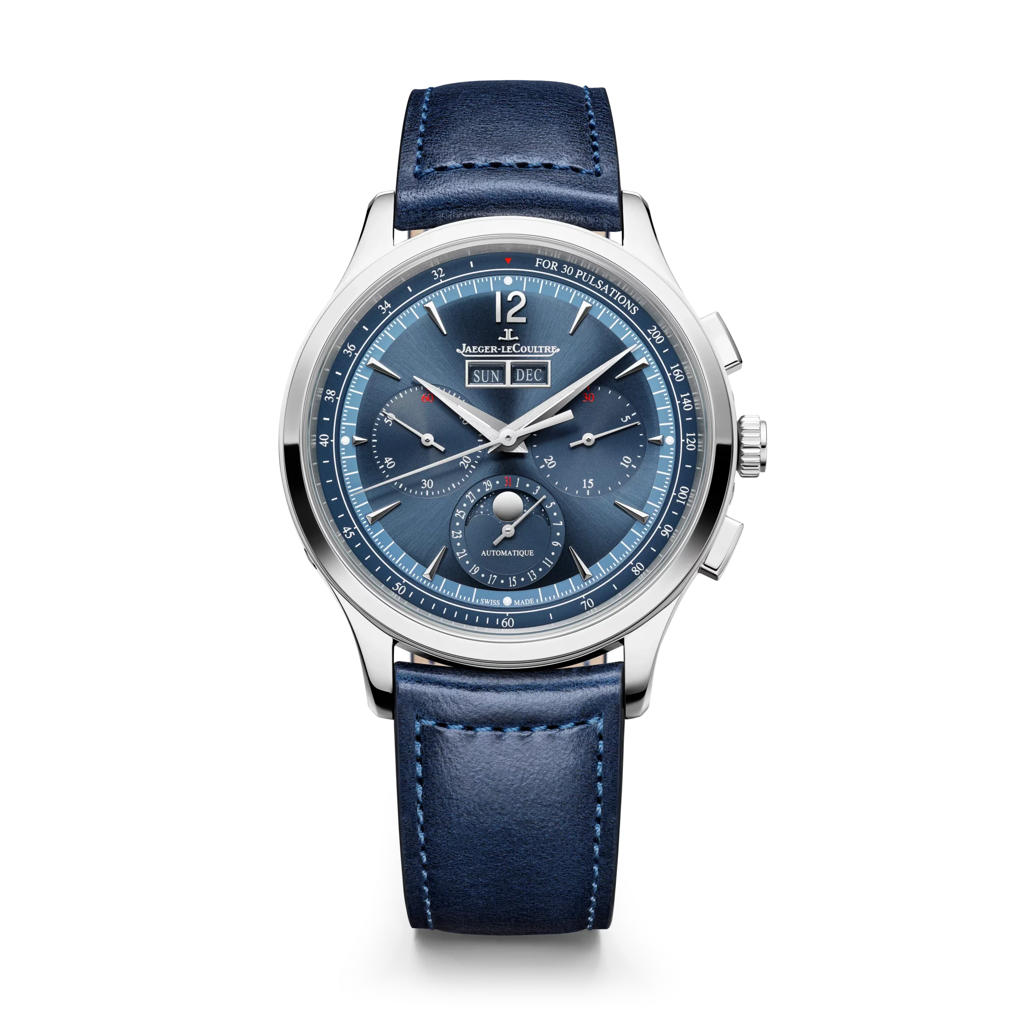 El Master Control Chronograph Calendar sigue los pasos de los relojes redondos tan populares en la década de 1950. Montado en una caja con acabado doble cepillado y pulido, el dial bicolor ofrece una legibilidad increíble para sus funciones (horas, minutos, segundos pequeños), así como para sus complicaciones, especialmente el cronógrafo con su escala pulsométrica y contador de 30 minutos. Visible a través del fondo de caja de cristal de zafiro, el calibre 759 de manufactura promete una reserva de marcha de 65 horas. Ofrecido con una variedad de correas intercambiables —una de eslabones de acero y otra de cuero azul—, el Master Control Chronograph Calendar puede cambiar su apariencia en un instante, manteniéndose resolutivamente a la vanguardia de la moda.