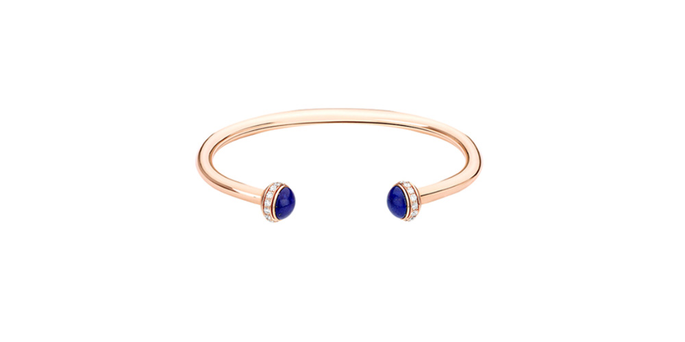 El brazalete abierto Possession en oro rosado de 18 quilates, engastado con 33 diamantes talla brillante y dos cabujones de lapis-lázuli, será el accesorio que querrás combinar con todo.