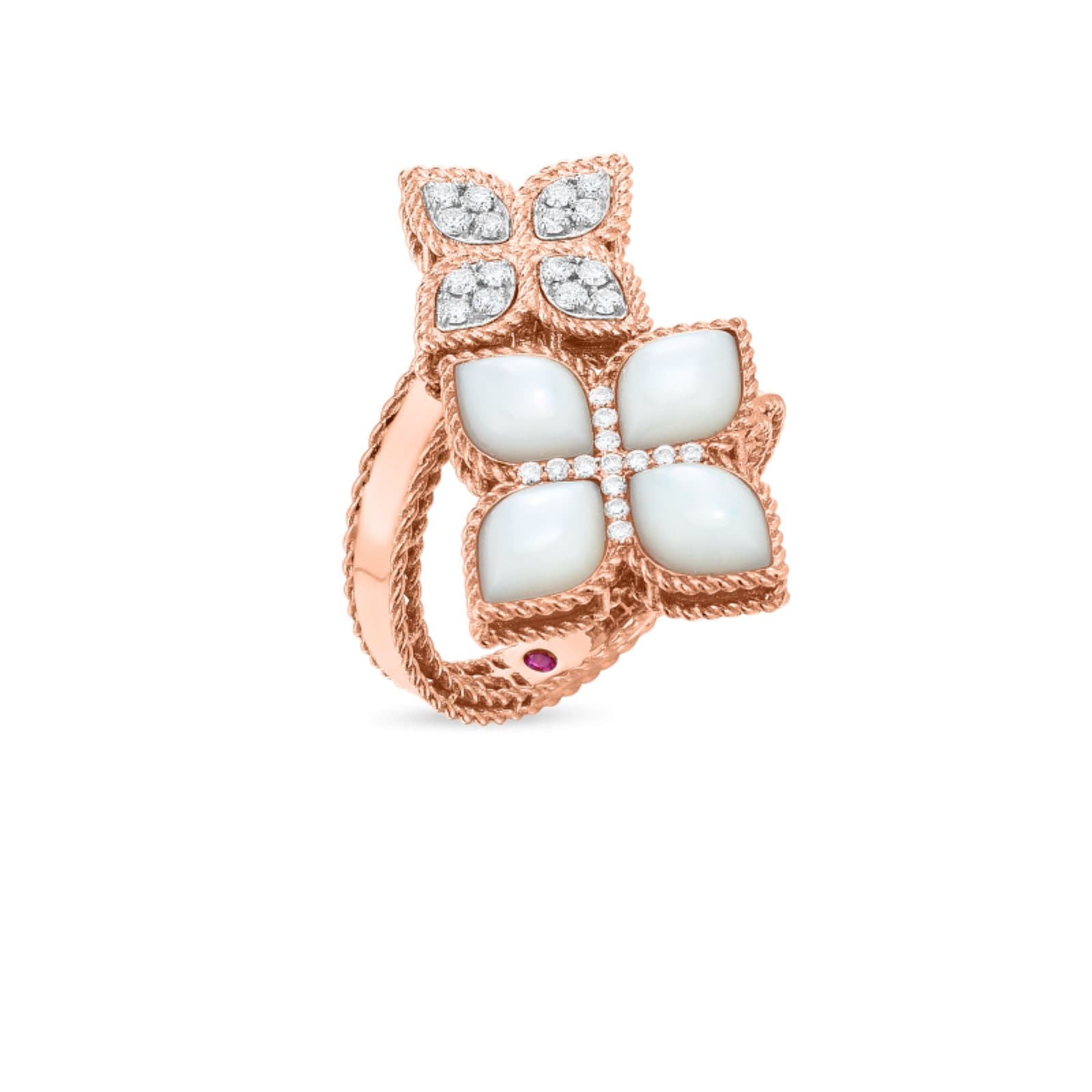 Anillo Princess Flower de Roberto Coin en oro rosa y blanco de 18k con madreperla y diamantes (~0.24 ct)