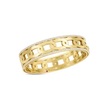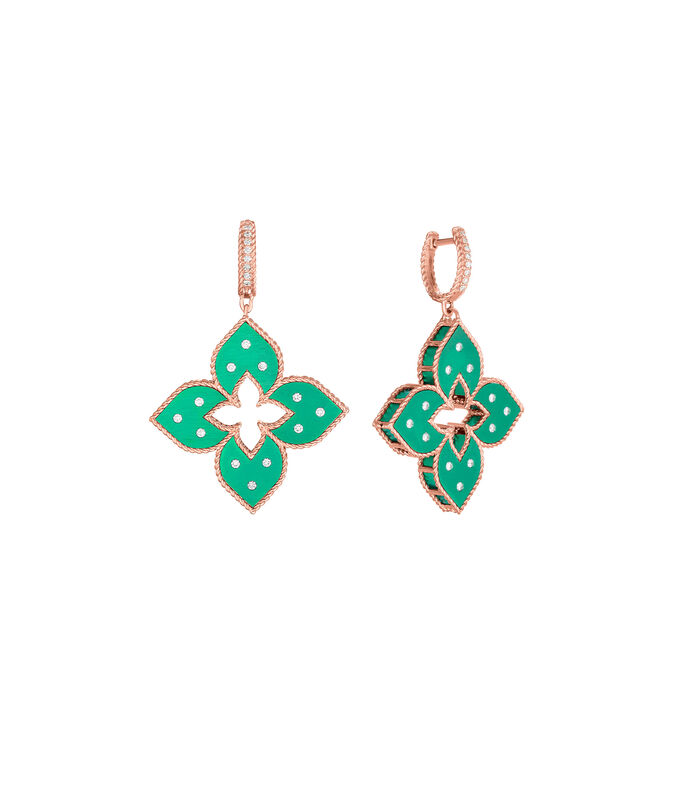 Aretes Roberto Coin Venetian Princess elaborados en oro rosa de 18 kilates con aplicación de diamantes, bloques verdes y elementos entrelazados. Irresistiblemente elegante, con un borde intrigante.