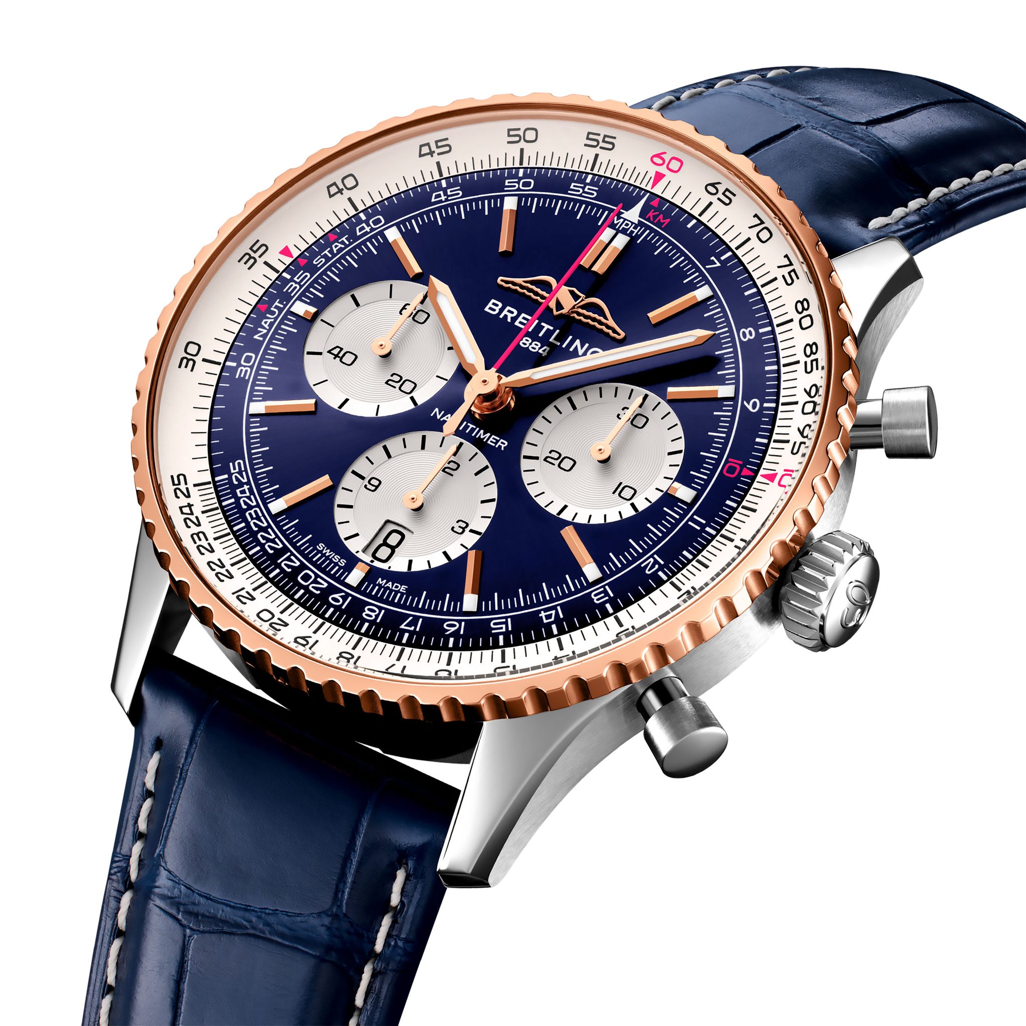 Carátula azul, marcadores blancos con contador de minutos del cronógrafo en rosa mexicano. Ventana de fecha en la posición de las 6 en punto.