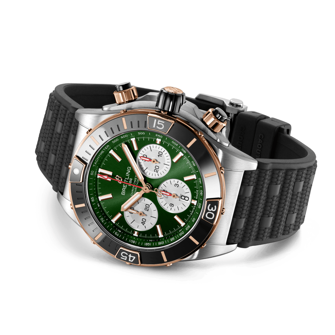 El reloj Breitling con potencia extra para cualquier actividad. El Super Chronomat se inspira en el Chronomat original de la década de 1980, que Breitling creó para los ases de las escuadrillas acrobáticas. El Super Chronomat, el modelo más audaz de todos los relojes Chronomat, presenta varias inserciones cerámicas –en el bisel, en los pulsadores de cronógrafo y en la corona– y una correa de goma de estilo Rouleaux. Aun así, este reloj deportivo todoterreno nunca supondrá un detrimento para su estilo personal. El Super Chronomat se presenta en distintas variantes de color y metal, desde acero inoxidable a oro rojo de 18K. Cuenta con el emblemático brazalete Rouleaux o con una correa de goma de estilo similar y con cierre mariposa. El Super Chronomat B01 44 está impulsado por el Calibre 01 de la manufactura Breitling, un cronómetro con certificación COSC.