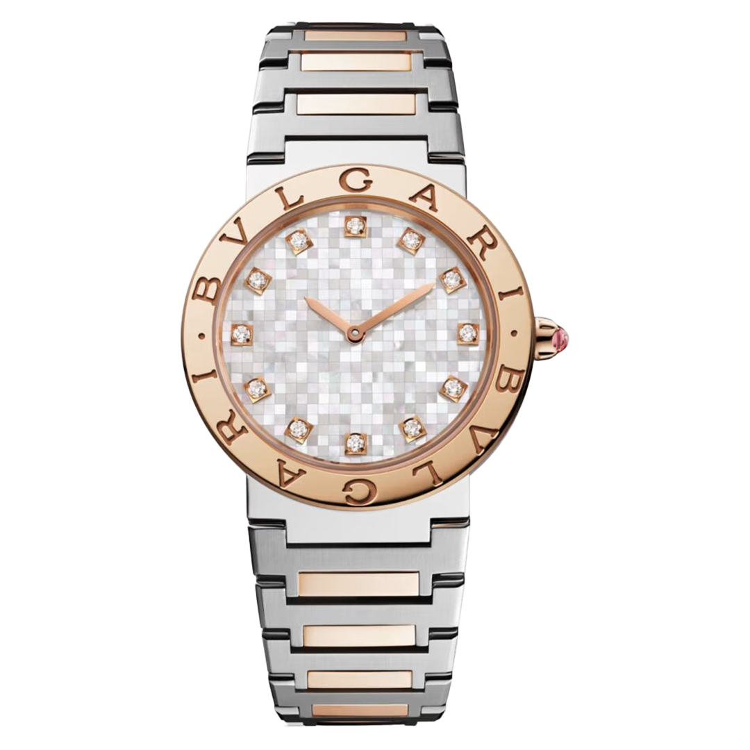 Reloj Bvlgari Bvlgari x LISA Edición Limitada en acero inoxidable y oro rosa de 18 qt con doble logotipo grabado en el bisel, esfera mosaico en madreperla blanca, índices de diamante y fondo de caja personalizado. Hermético hasta 30 metros