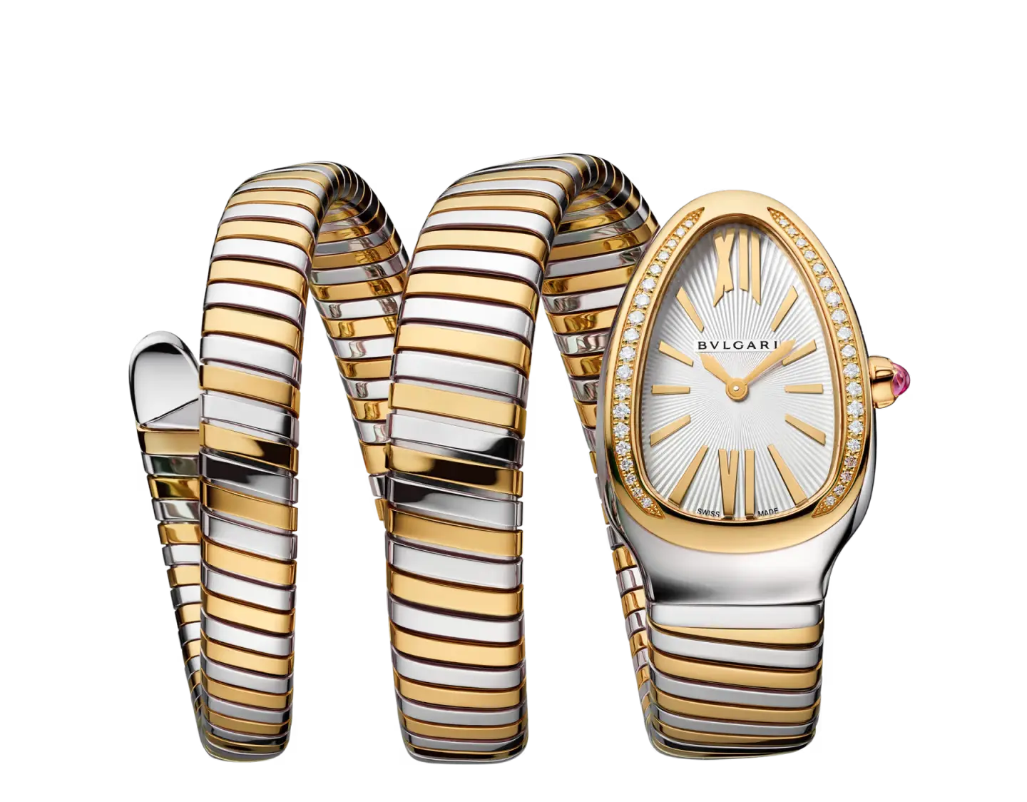 Reloj Serpenti Tubogas con movimiento de cuarzo, funciones de horas y minutos, calibre B033 decorado con el logotipo de Bvlgari, caja de 35 mm en acero inoxidable, bisel en oro amarillo de 18 qt engastado con 38 diamantes redondos talla brillante, esfera plateada opalescente con grabado guilloché soleil, corona en oro amarillo de 18 qt engastada con una rubelita talla cabujón y brazalete de dos vueltas en acero inoxidable y oro amarillo de 18 qt. Hermético hasta 30 metros.