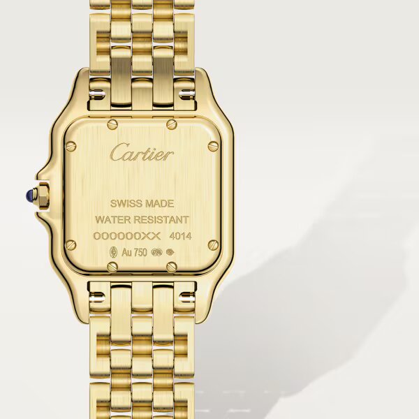 Reloj Panthère de Cartier, tamaño mediano, movimiento de cuarzo. Caja de oro amarillo 750/1000. Dimensiones: 29 mm x 37 mm. Grosor: 7 mm. Corona decorada con un zafiro azul. Esfera plateada. Agujas de acero azulado en forma de espada. Brazalete de oro amarillo 750/1000. Hermético hasta 3 bares (aprox. 30 metros).