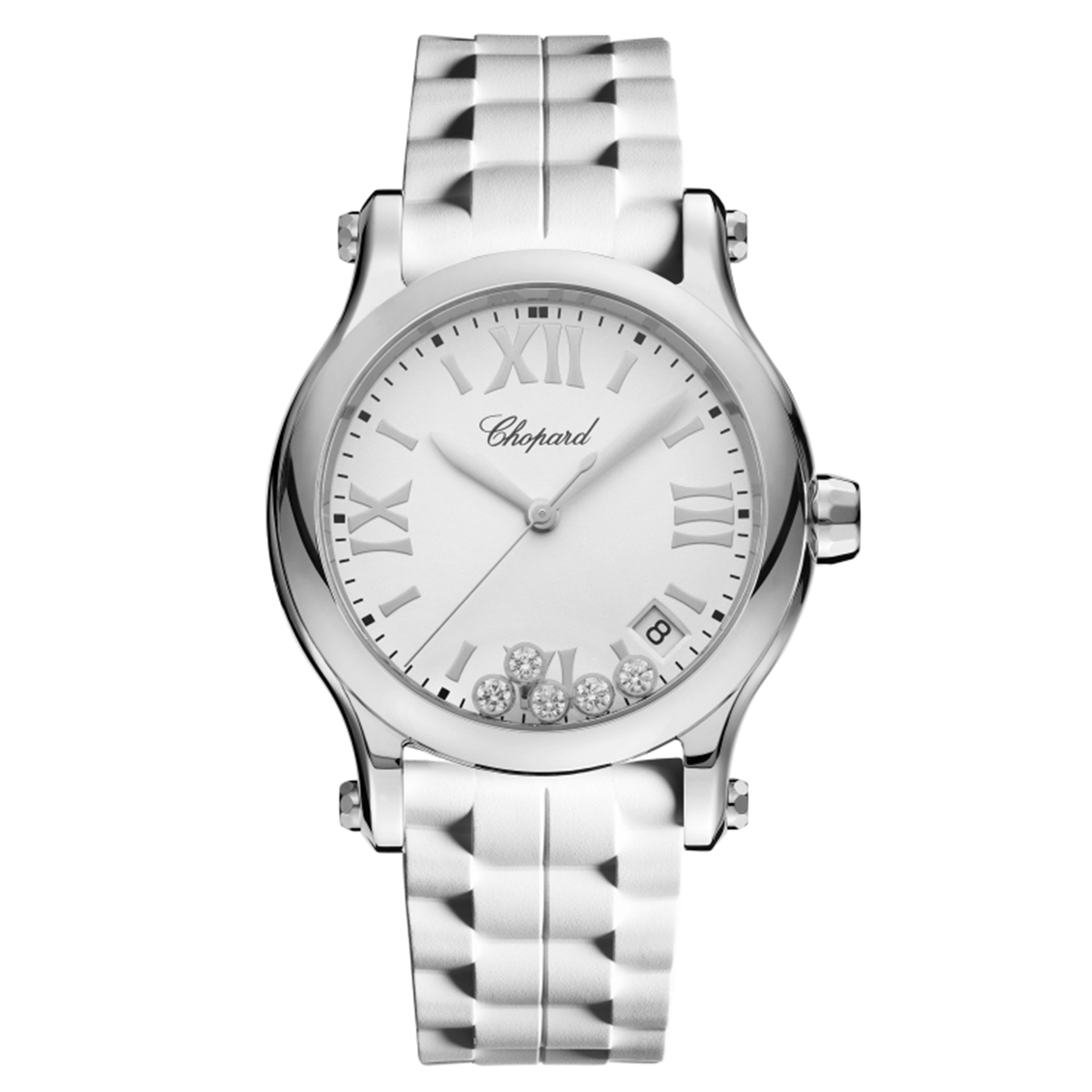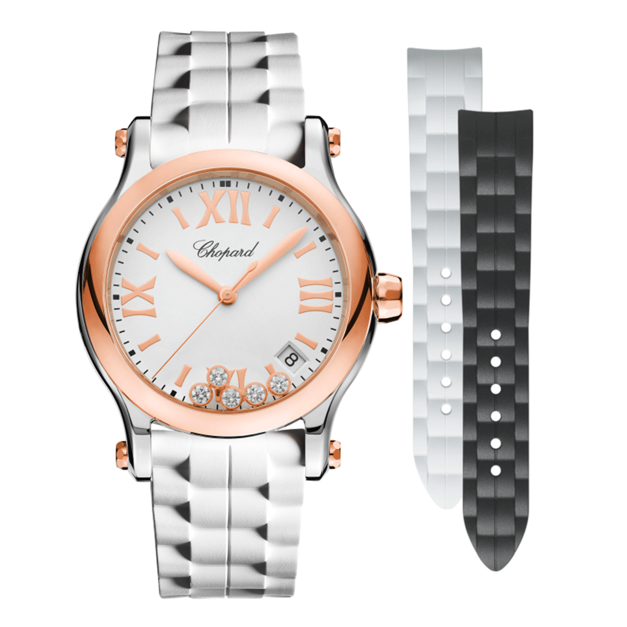 Desde 1993, Happy Sport ha creado una alegre fusión, acero y diamantes, mezclando lo eterno y efímero. Con un enfoque visionario y vanguardista. Sofisticado pero deportivo. Este modelo apuesta por un espíritu de personalización casera: ofrece a su propietaria la posibilidad de cambiar la correa de su reloj en la comodidad de su hogar y cuando lo deseen. Little Diamonds Do Great Things