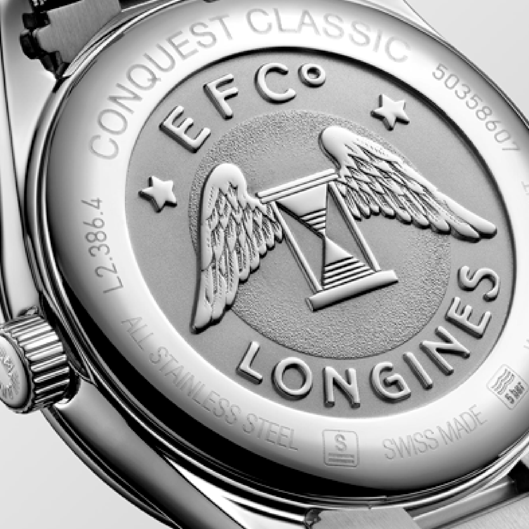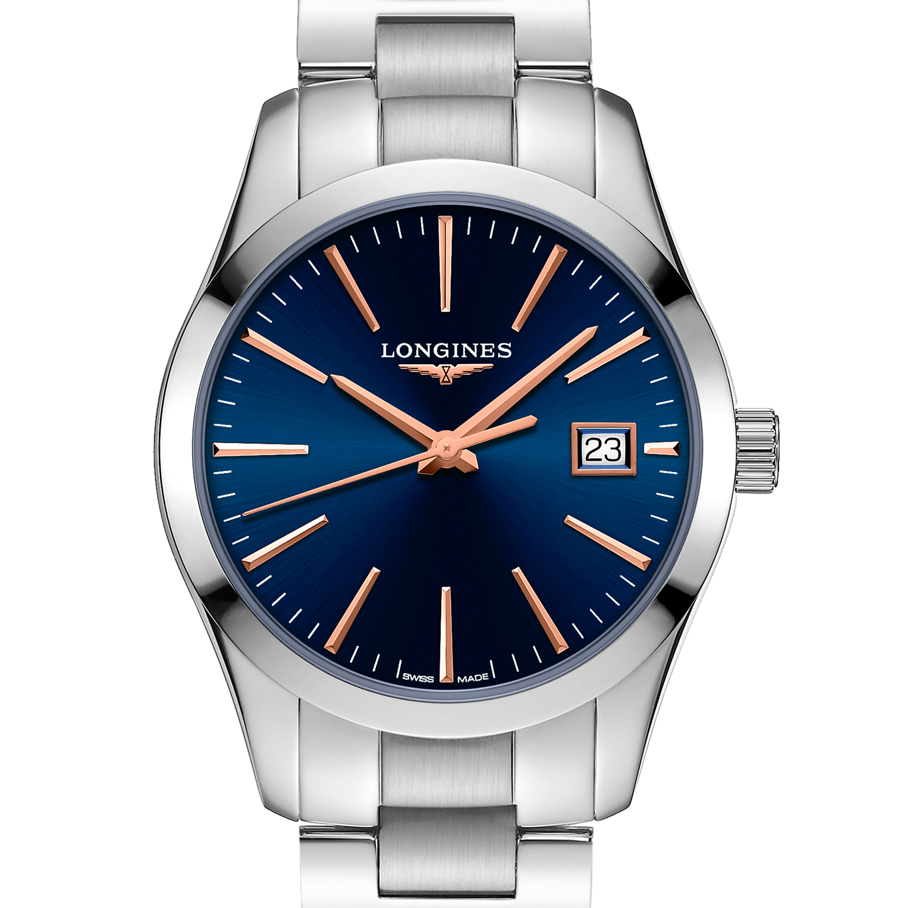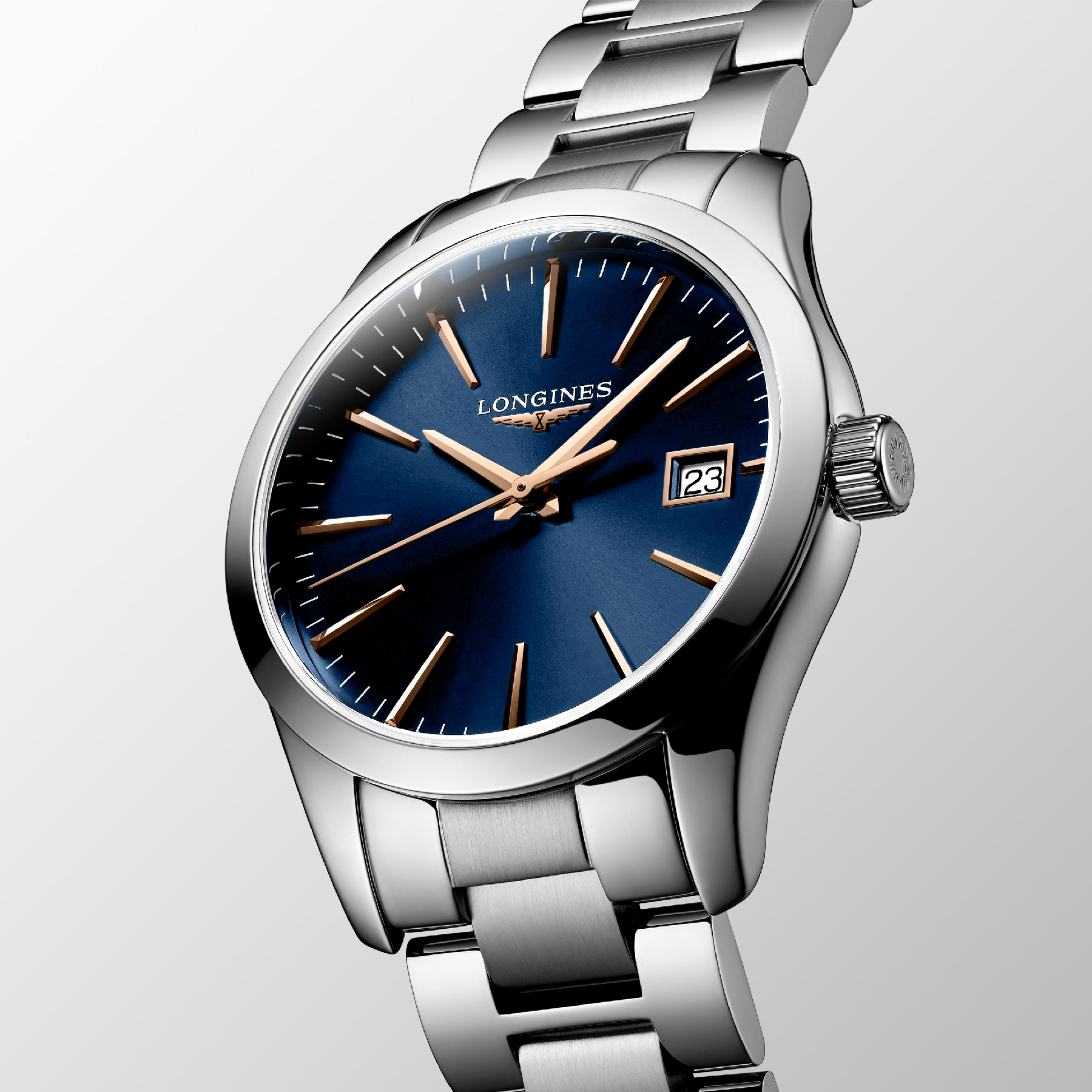 El nuevo Conquest Classic presenta un dinamismo refinado. Con una caja y brazalete en acero inoxidable, carátula azul adornada con agujas e índices rosas y movimiento de cuarzo; estanqueidad hasta 50 metros.