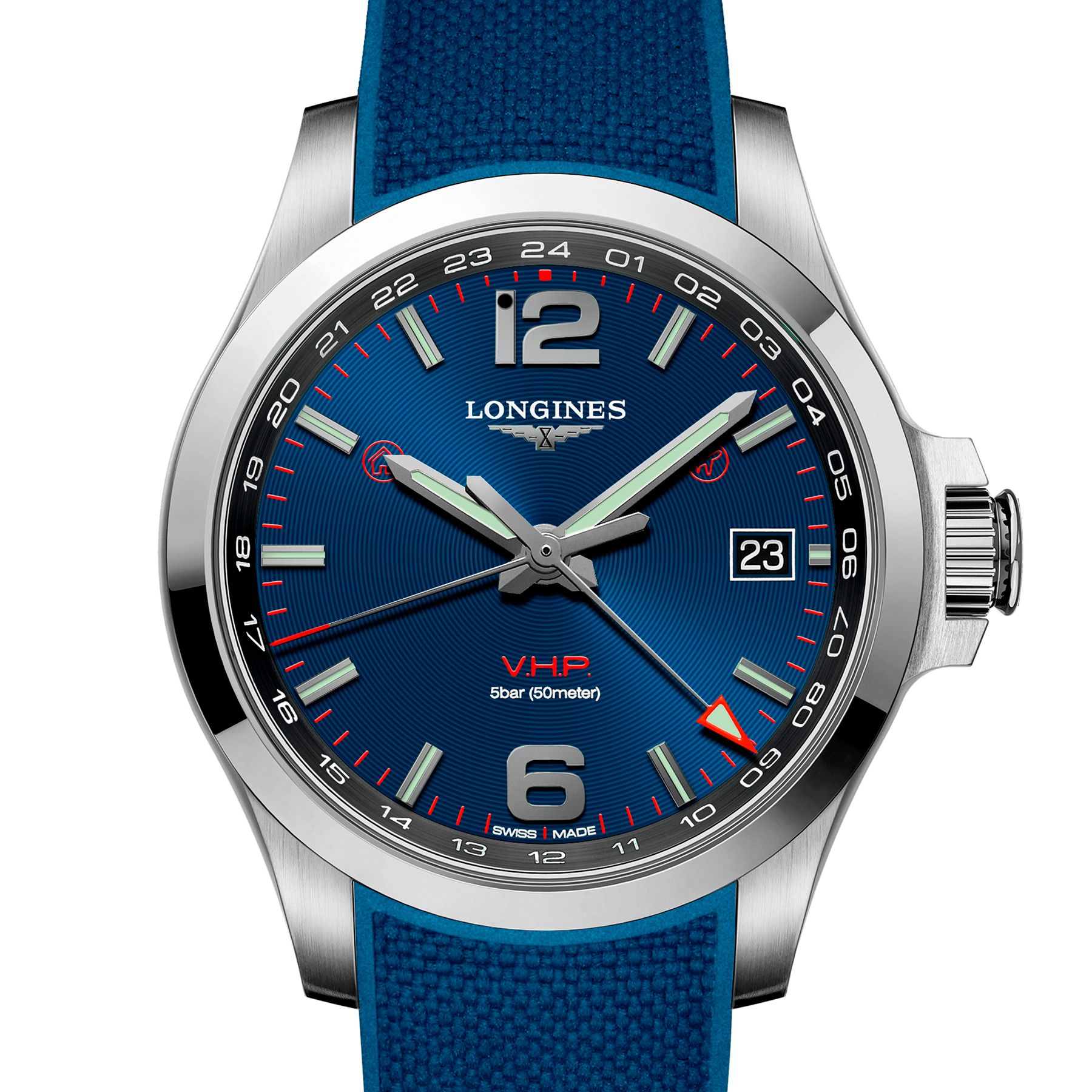 Conquest V.H.P. GMT es el reloj de los viajeros, revoluciona tanto la precisión relojera como la experiencia de usuario. Con un movimiento de cuarzo ultra-preciso (± 5 s/año), sistema DPR, pila de larga duración, calendario perpetuo y corona inteligente.