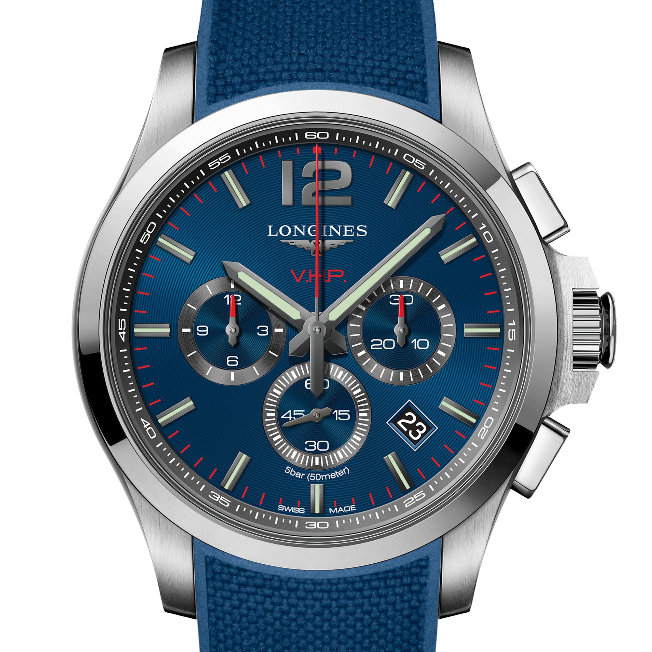 Longines Conquest V.H.P. combina ultra-precisión, alta tecnología y espíritu deportivo, con cristal de zafiro resistente a los arañazos y carátula azul, funciones de cronógrafo, manecillas e indicadores con Super-LumiNova y estanqueidad hasta 50 metros.