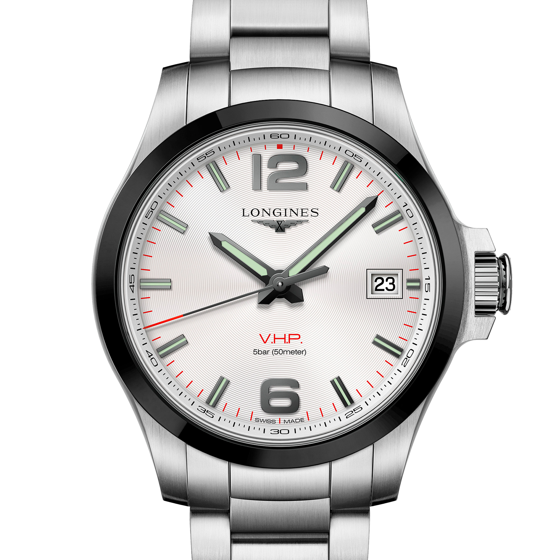 Conquest V.H.P. es el reloj más preciso, combina alta tecnología y espíritu deportivo, con un movimiento de cuarzo ultra-preciso (± 5 s/año), sistema DPR, pila de larga duración, calendario perpetuo y corona inteligente.