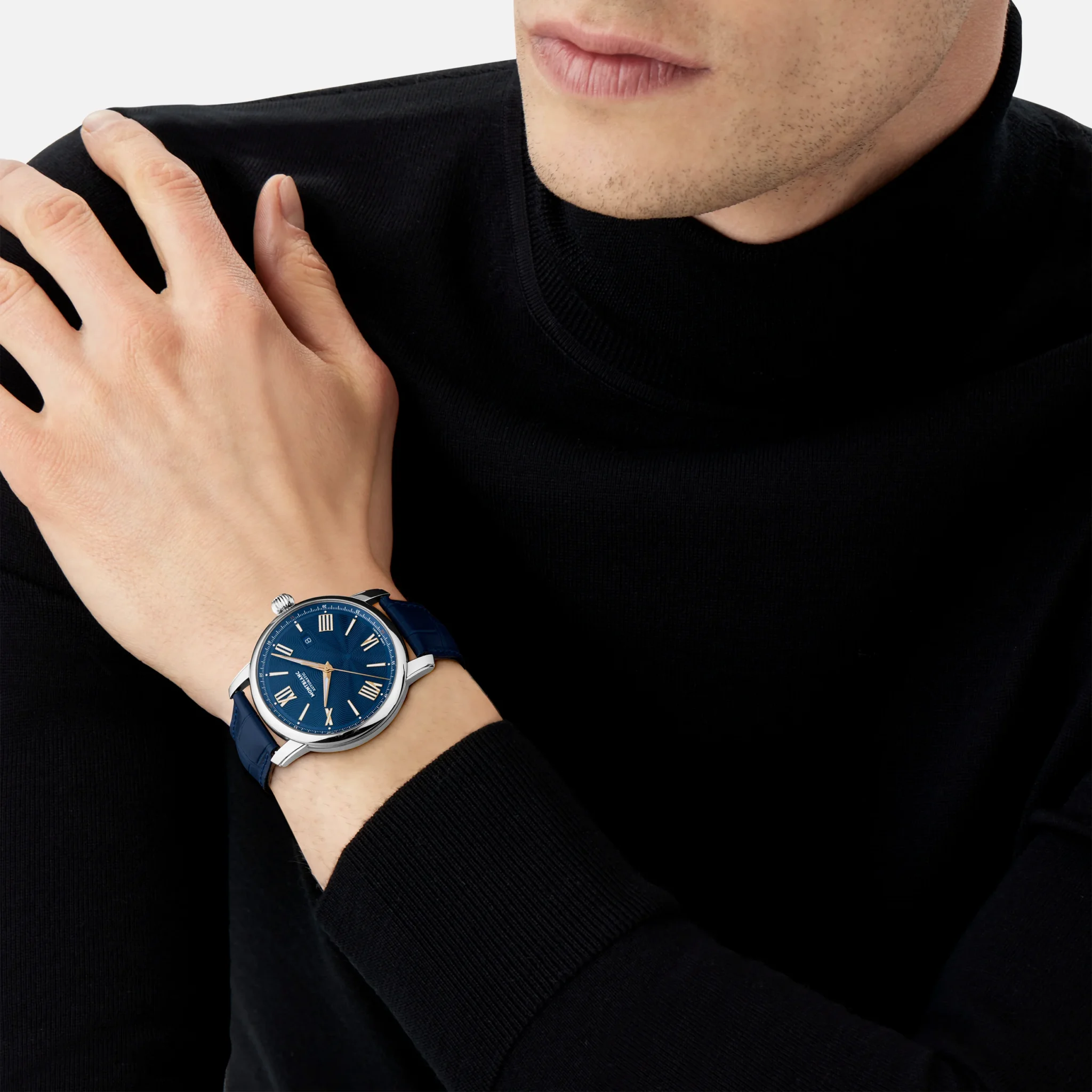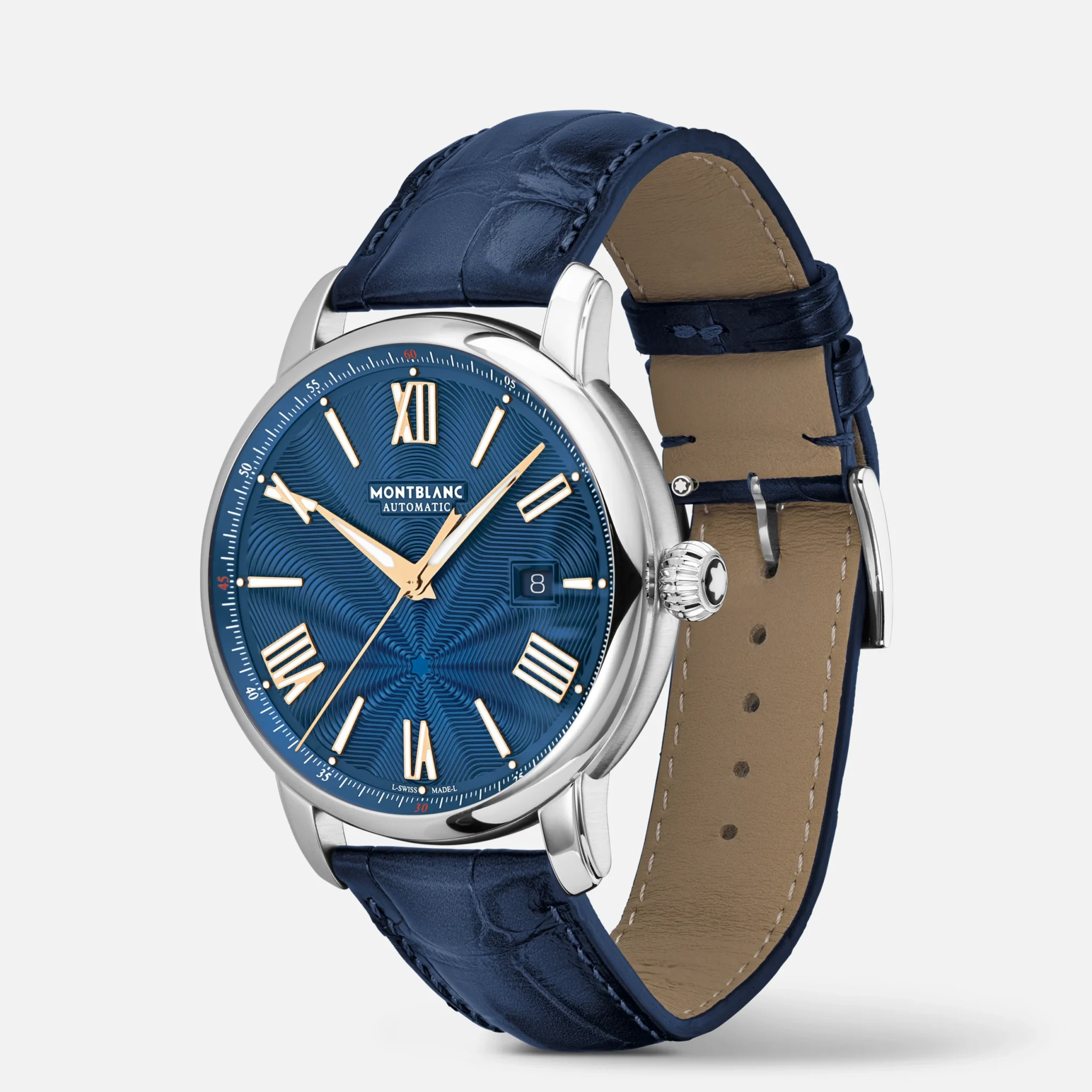El Montblanc Star Legacy Automatic Date Edición Limitada a 800 piezas está adornado con una esfera azul con el característico motivo de estrella en expansión de Montblanc y agujas y números en forma de espada chapados en oro rosa. Está equipado con el movimiento automático MB 24.17 que indica las horas, los minutos, los segundos y la fecha. En cuanto al diseño, el reloj presenta una caja redonda con acabado pulido y una corona en forma de cebolla, inspiradas en los relojes de bolsillo Minerva de finales del siglo XIX y principios del XX. Este reloj también está equipado con una correa intercambiable de piel de becerro azul con grabado caimán y costuras tono sobre tono.