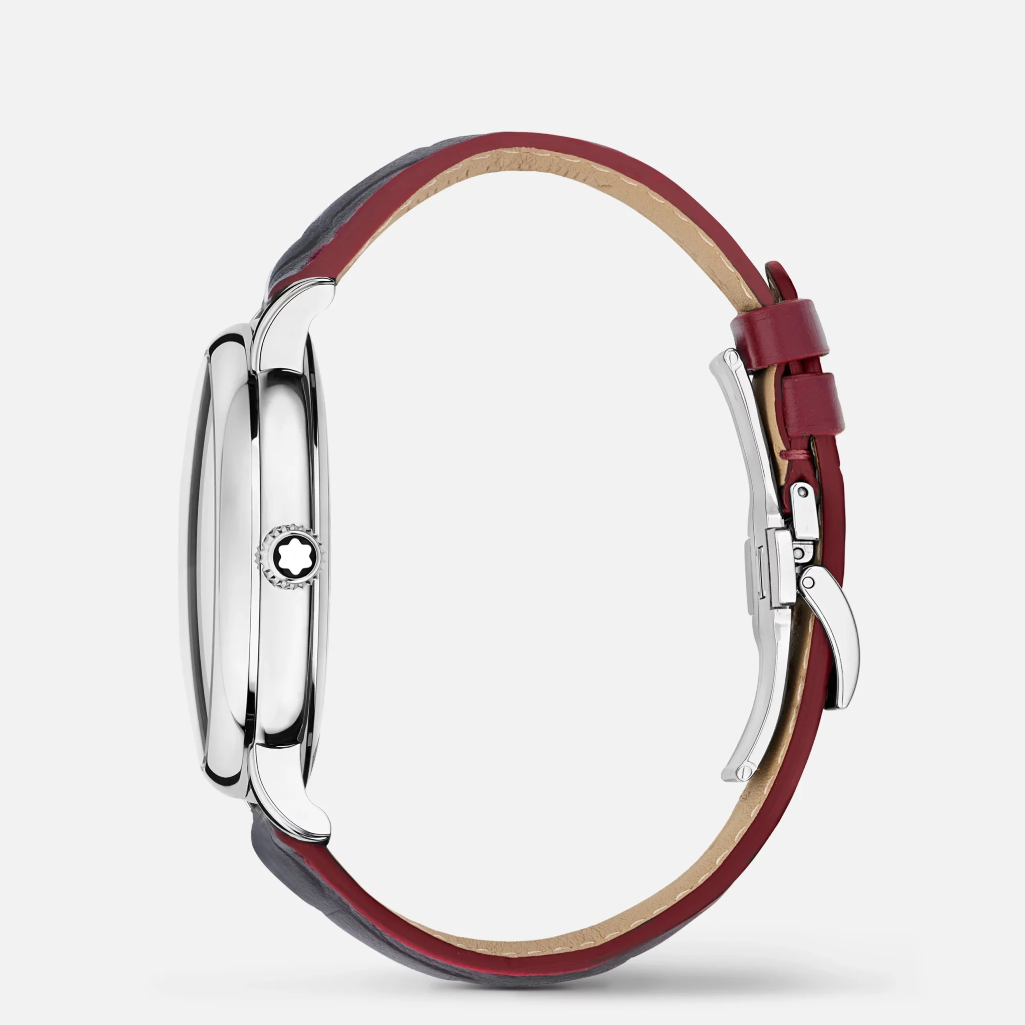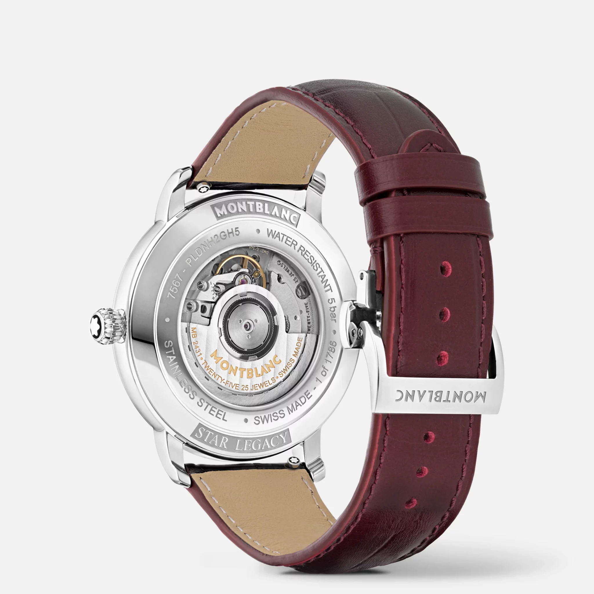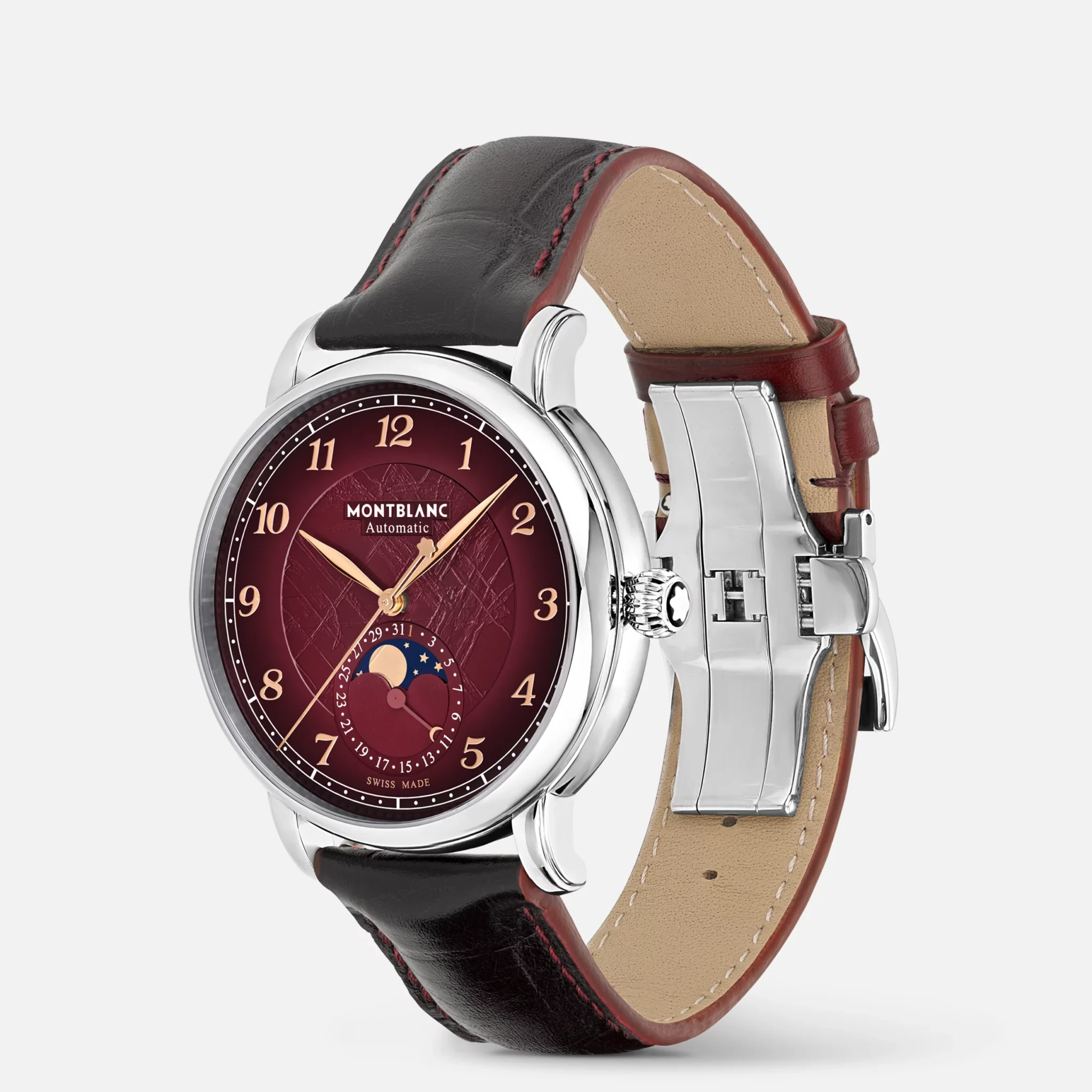El Montblanc Star Legacy Moonphase Edición Limitada a 1786 piezas rinde homenaje al intrépido Jacques Balmat, la primera persona en alcanzar la cumbre del Mont Blanc en 1786. El reloj presenta una esfera con un motivo de glaciar color burdeos con un efecto sfumato a su alrededor, un motivo filet sauté , agujas y números chapados en oro rosa, y un emblema Montblanc en el contrapeso del segundero. Esta apreciada complicación de fase lunar muestra las fases lunares a las 6 con unas elegantes luna y estrellas chapadas en oro rosa sobre un fondo azul que están rodeadas por un indicador de fecha redondo. Este modelo está equipado con el movimiento automático 24.31 y presenta una caja de acero de 42 mm con una tapa trasera abierta en el movimiento. El reloj incluye una correa intercambiable de piel de becerro con estampado de piel de caimán y sfumato vertical.
