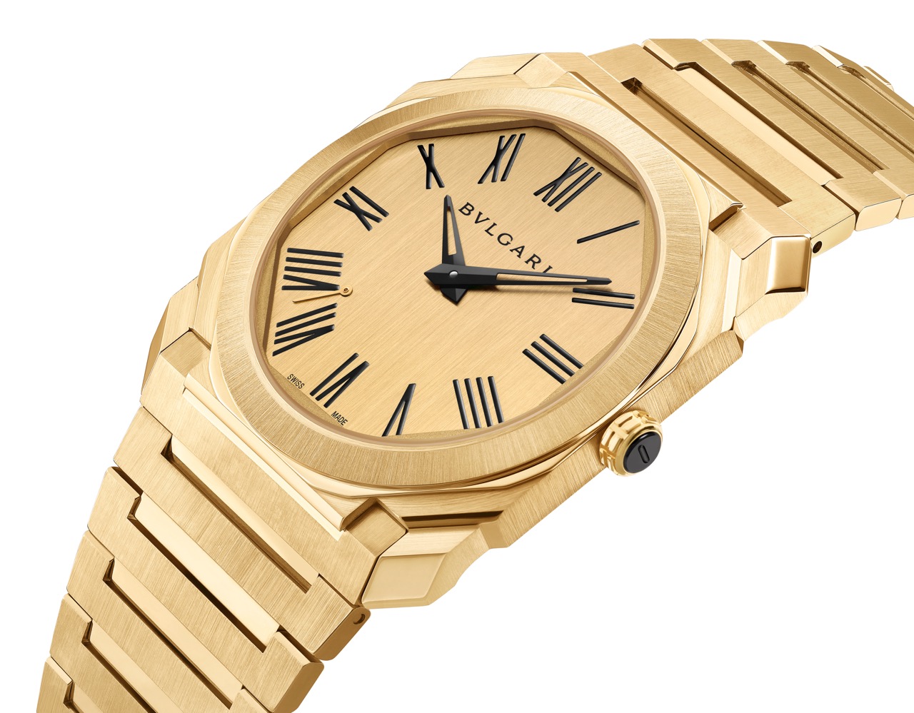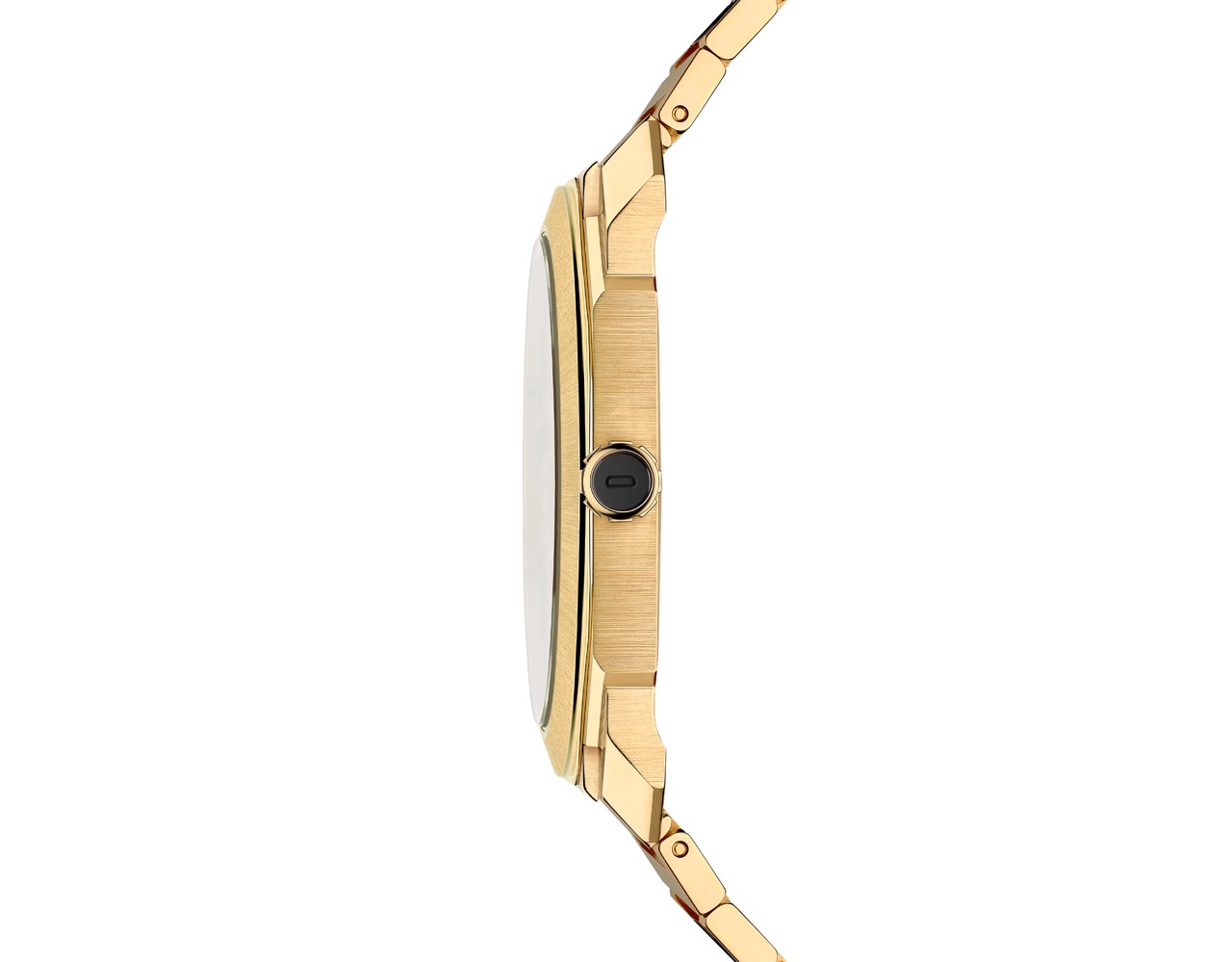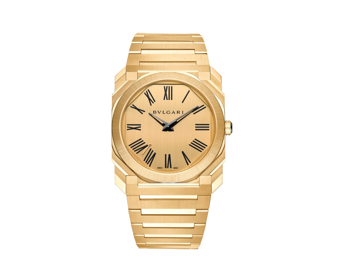 • Una esfera de oro amarillo cepillado con agujas e índices romanos en tono negro.