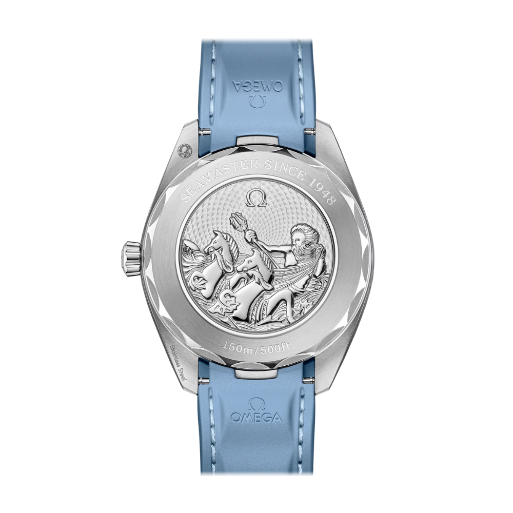 Al dar la vuelta al reloj se descubre estampado un logotipo Seamaster conmemorativo que representa a Poseidón con un tridente y a dos caballitos de mar: el OMEGA original de 1956 y el diseño actual de la firma. Debajo se encuentra el OMEGA Co-Axial Master Chronometer calibre 8900, certificado al más alto nivel del sector por el Swiss Federal Institute of Metrology (METAS).”