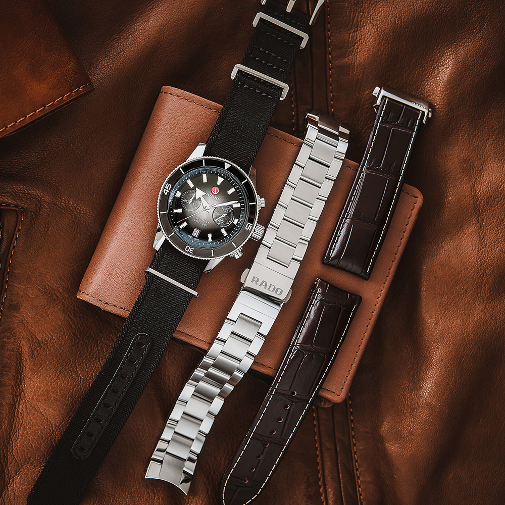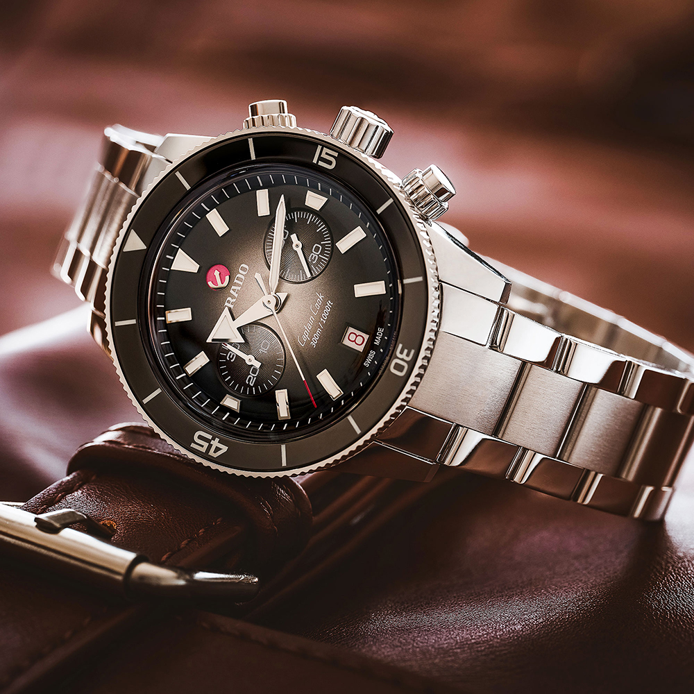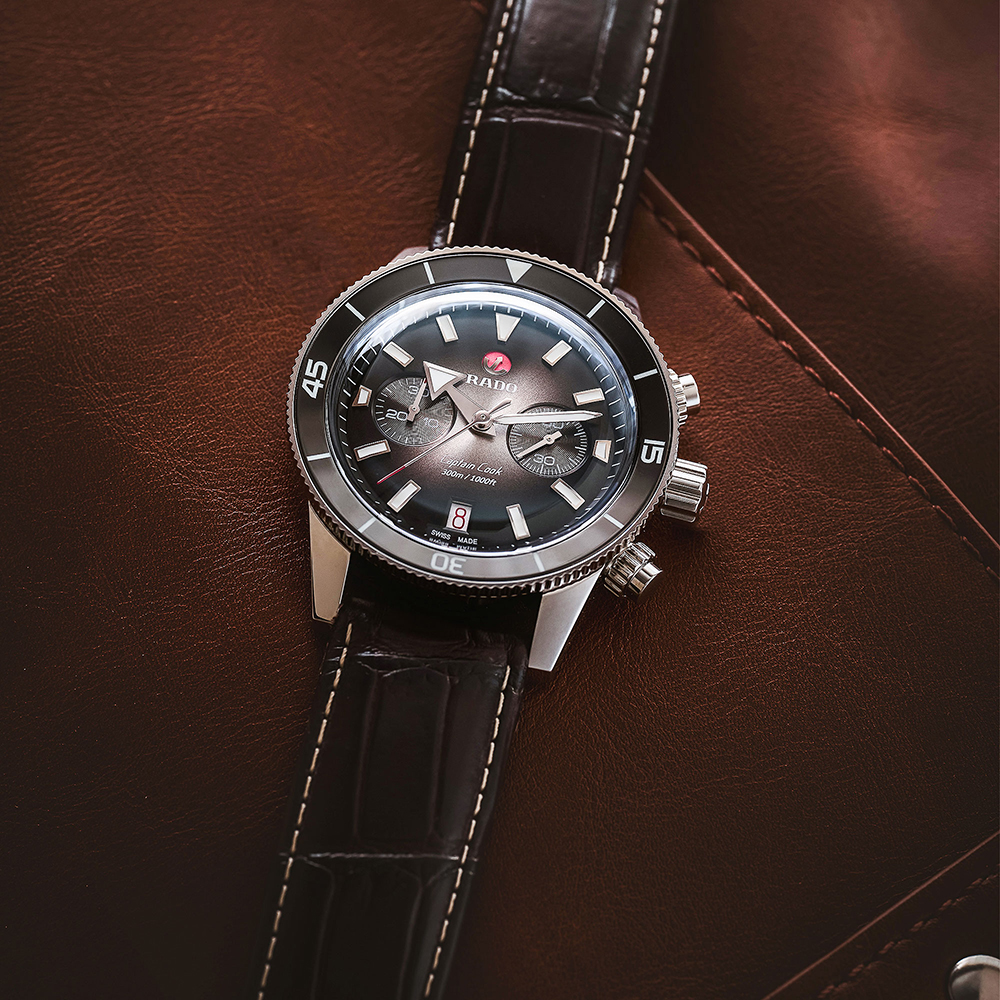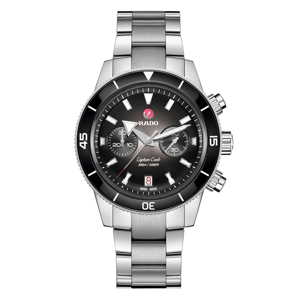 El cronógrafo Captain Cook incorpora un característico cristal de zafiro en forma de caja con tratamiento antirreflejo en ambas caras. La elegante y fina caja de 43 mm, elaborada en acero inoxidable, incorpora en el bisel una incrustación de cerámica pulida de alta tecnología de color negro, que complementa la esfera de color plata y negro con efecto degradado. Los números, las marcas y los triángulos están tratados con Super-LumiNova®. En el interior, el nuevo mecanismo automático R801, aún más fino, con 37 piedras preciosas, cinco agujas y 59 horas de reserva de marcha gracias a la espiral de Nivachron™ antimagnética, supera los requisitos de ensayo especificados en las normas (cinco posiciones en lugar de tres) con el fin de ofrecer mayor exactitud. El modelo incluye un brazalete de acero inoxidable pulido y cepillado, además de una correa de cuero de color marrón y una correa de tela de color negro.