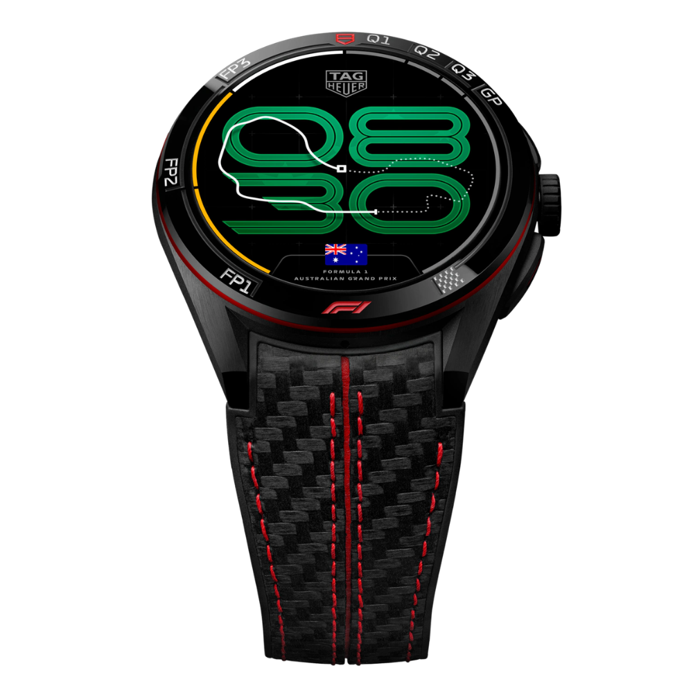 Diseñado para los apasionados de la F1, con caja de titanio ultraligero y bisel de cerámica negra grabado. Sus 24 esferas digitales se actualizan con cada circuito de la temporada y la app exclusiva Formula 1® ofrece calendario, resultados y clasificaciones en tiempo real, llevando la emoción de cada Gran Premio a la muñeca.