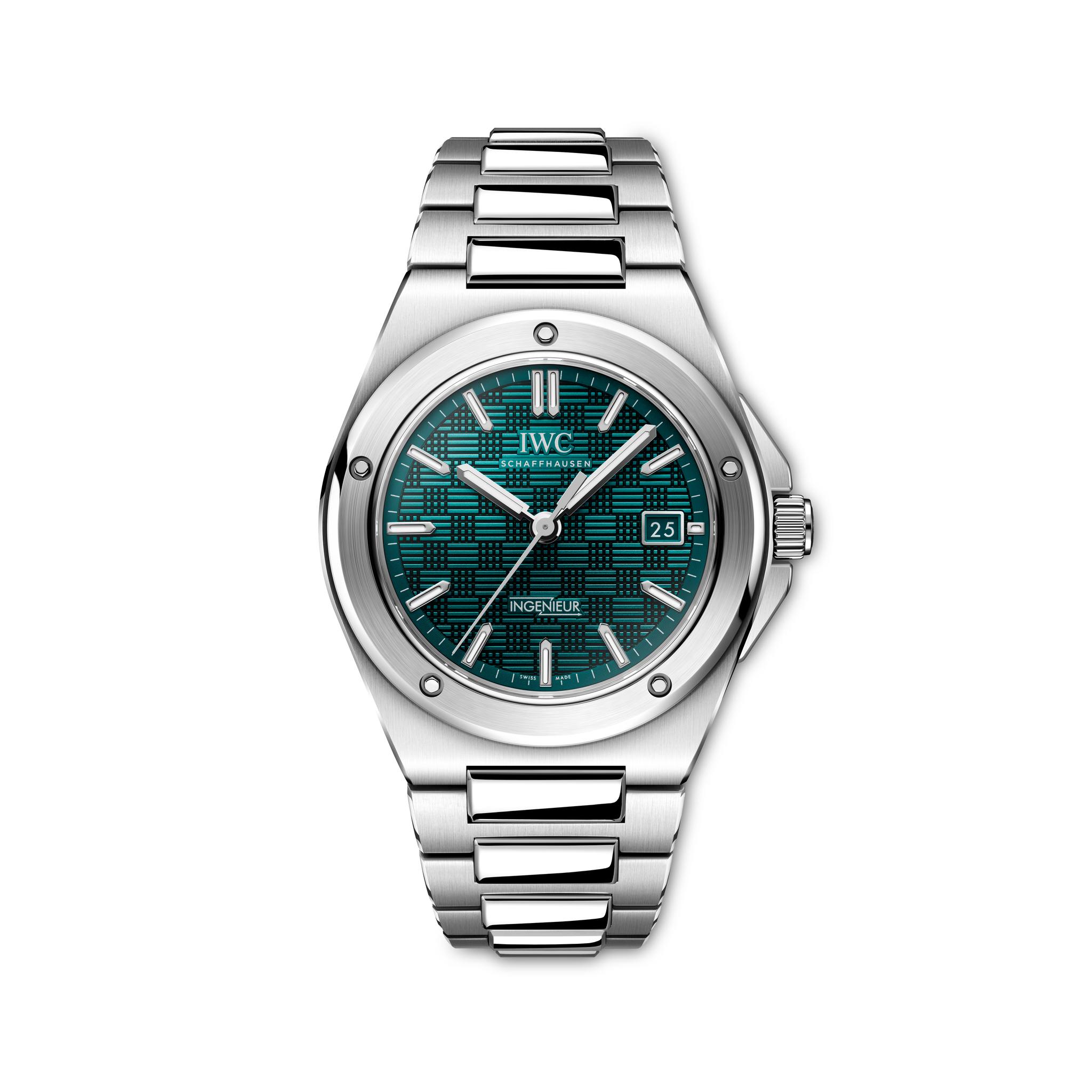 El modelo se inspira en aquel icono, pero ha sido creado con lo mejor de la ergonomía, los acabados y la tecnología actuales. También mide 40 mm y conserva el inconfundible bisel con cinco tornillos. No obstante, en el caso del Ingenieur SL, el bisel iba atornillado sobre el anillo de la caja, lo que provocaba que los rebajes ocuparan una posición diferente en cada reloj. En cambio, en el Ingenieur Automático 40, el bisel va asegurado con cinco tornillos a la caja. Como estos tornillos tienen una función técnica, se colocan siempre en la misma posición. Otro punto a considerar es que la distancia entre las asas es de 45.7 mm; esto, aunado al anillo curvado de la caja, garantiza una gran comodidad. Esta versión con carátula color verde destaca por su belleza y atemporalidad.