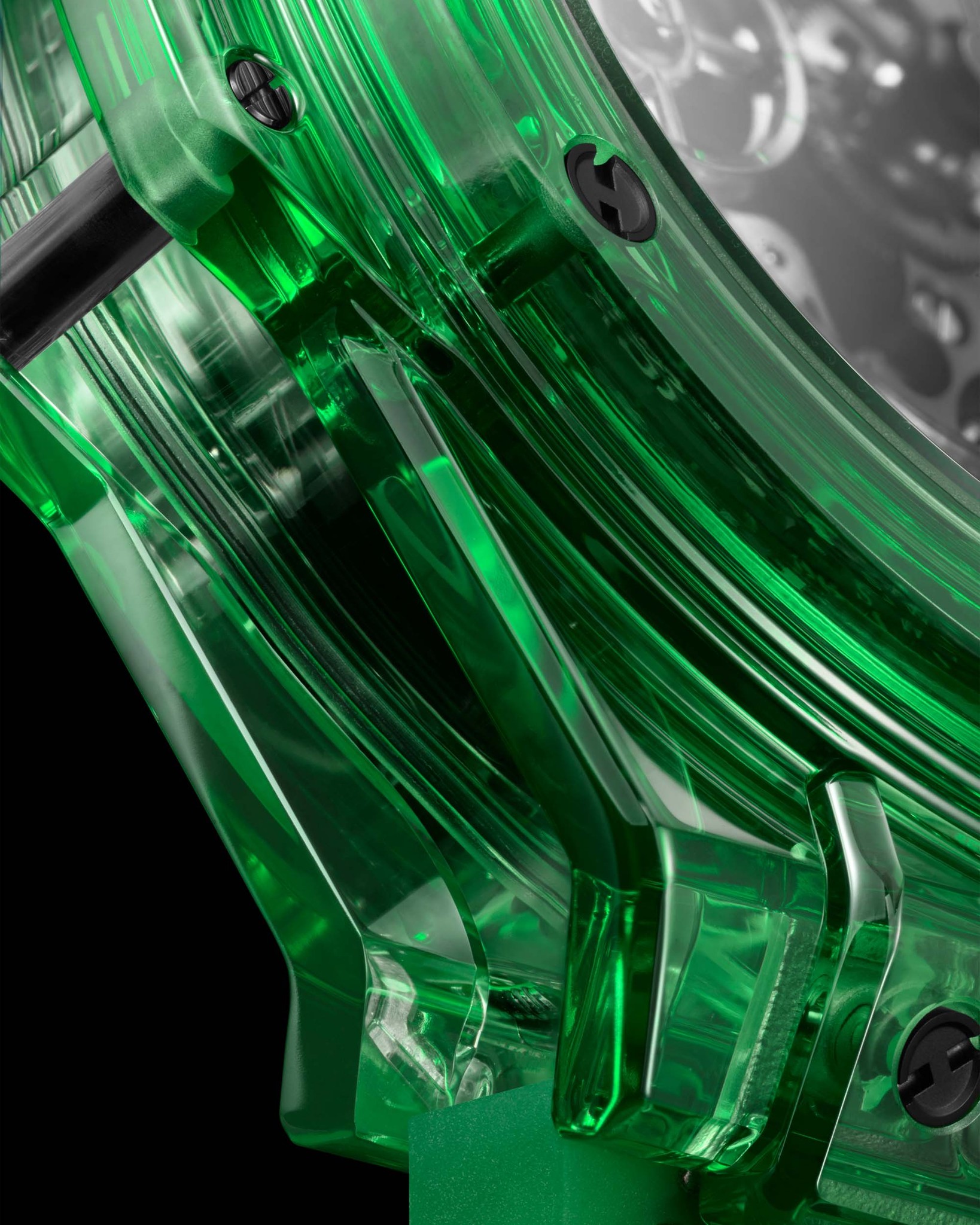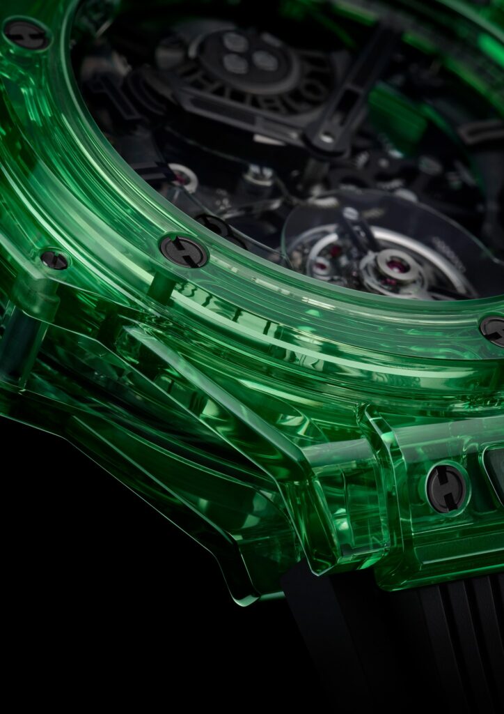 Hublot se viste de protagonista con el Big Bang Tourbillon Automatic Green SAXEM, dando un paso más técnico y aplaudido al de por sí cotizado material. El Big Bang Tourbillon Automatic Green SAXEM es descrito por la Maison como verde esmeralda. La caja SAXEM verde pulida de 44 mm alberga el movimiento de tourbillon automático MHUB6035 de manufactura. Este calibre cuenta con un micro-rotor de oro de 22 quilates ubicado en el lado de la carátula a las 12 en punto, lo que proporciona una reserva de marcha de 72 horas. La arquitectura contemporánea del movimiento se ve acentuada por tres elementos de zafiro funcionales para el puente del barrilete, el puente de los engranajes de cuerda automática y la barra del tourbillon, con la jaula del tourbillon de 60 segundos ubicada a las seis horas.