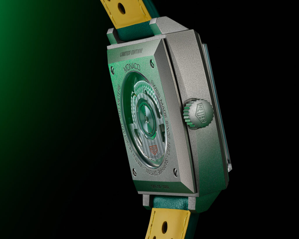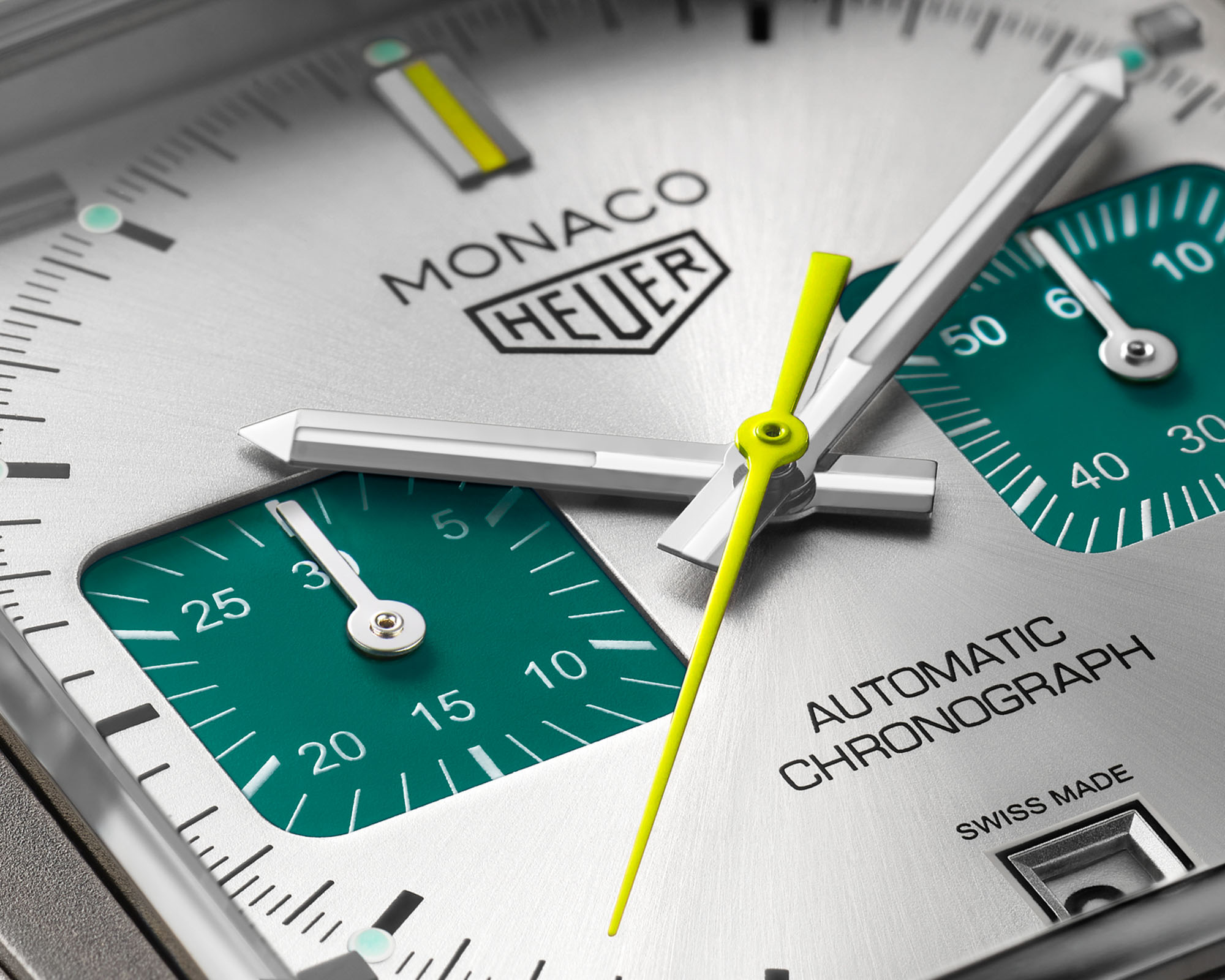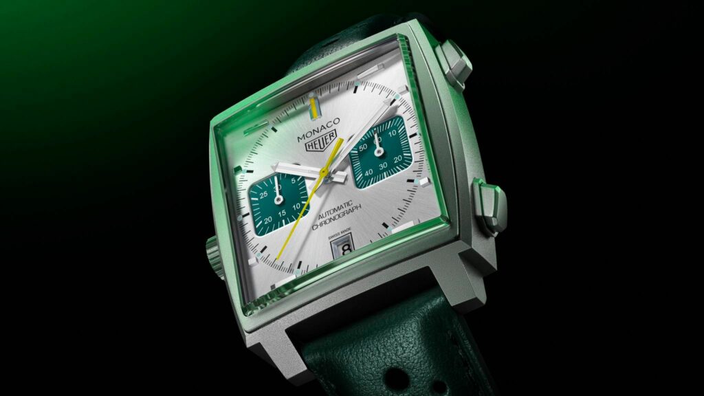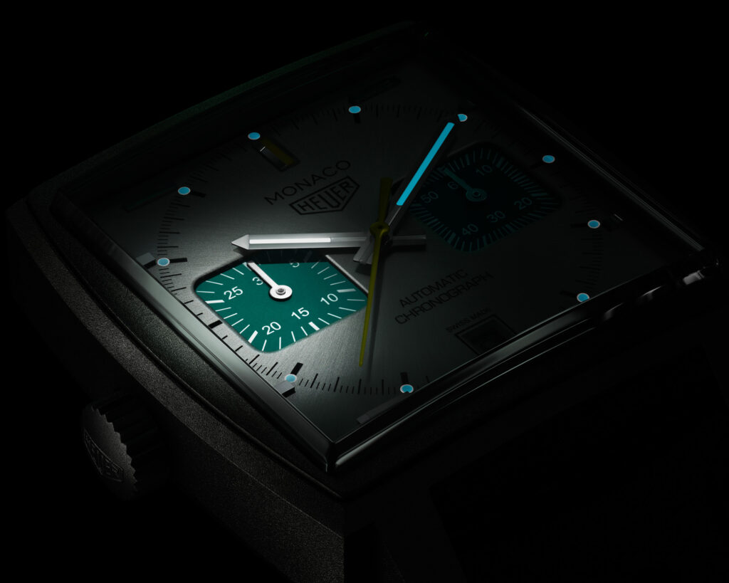 TAG Heuer ha creado una nueva versión con caja de titanio, carátula plateada con efecto rayos de sol acentuada por ricos acentos verdes y reflejos de color amarillo brillante. El nuevo TAG Heuer Monaco Chronograph Racing Green es esencialmente la versión verde del Monaco Chronograph Racing Blue que se lanzó el año pasado y, al igual que su predecesor de color azul, la nueva versión Racing Green se producirá como una Edición Limitada a 1,000 ejemplares. Esta maravilla en british racing green presenta la configuración de estilo vintage original del Monaco, con la corona ubicada en el lado de las 9 en punto de la caja (en lugar de entre los pulsadores a las 3 en punto) y está equipado con totalizadores verdes con efecto rayos de sol que muestran sus respectivos colores en sus registros de cronógrafo.