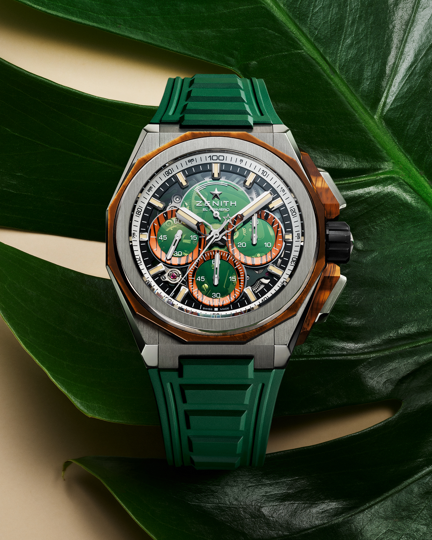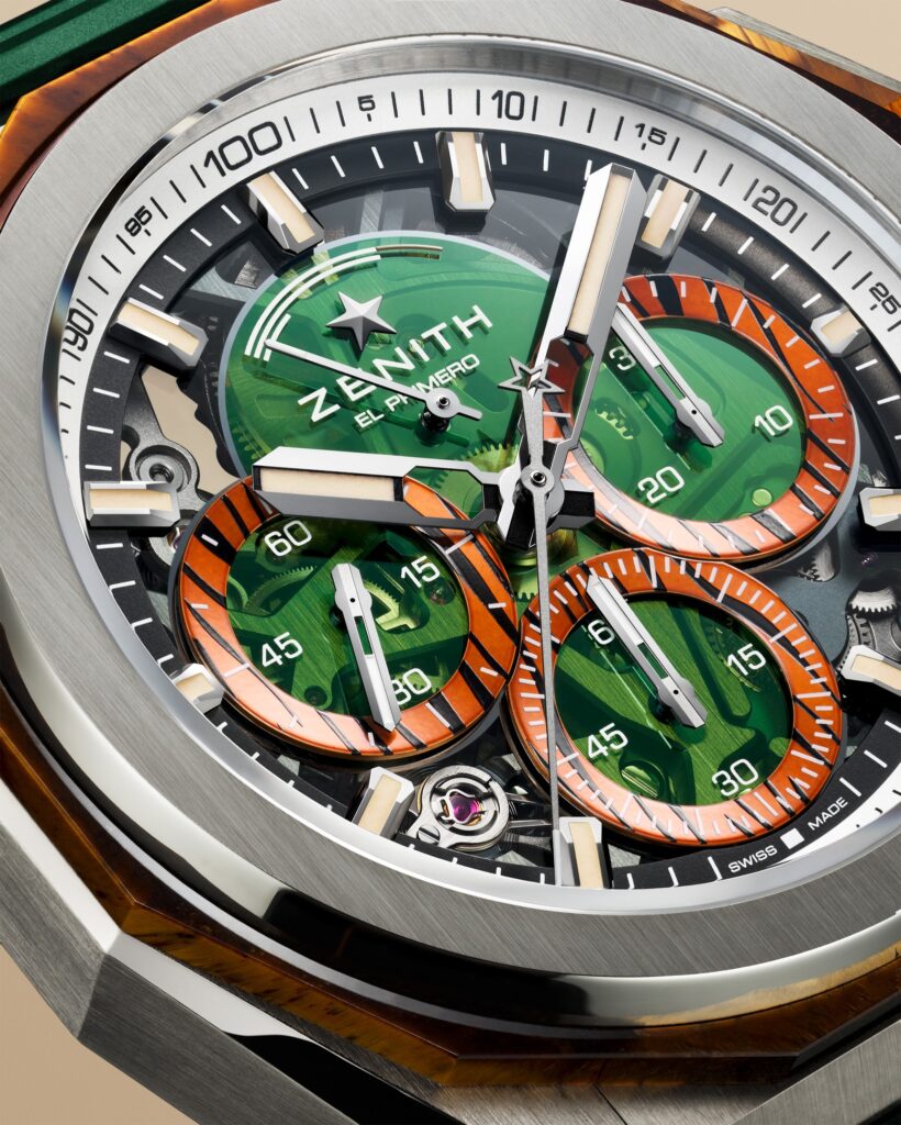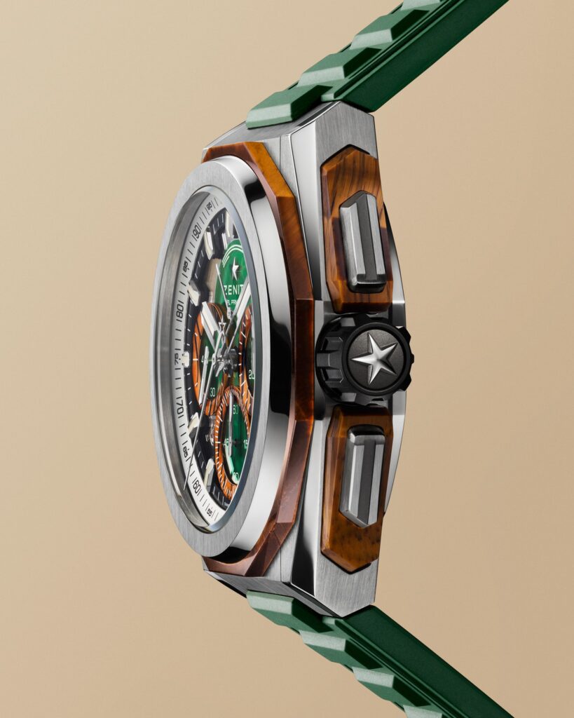 Fabricada en titanio cepillado, la caja ligera pero resistente de 45 mm presenta un bisel dodecagonal y protectores de pulsadores hechos de ojo de tigre. Con sus llamativos tonos dorados a marrones, reflejos cambiantes y un brillo sedoso, el ojo de tigre pertenece a la familia del cuarzo y se ha utilizado durante mucho tiempo en joyería y ornamentación. Cada reloj es único debido a las variaciones naturales de esta rara piedra. Sus estrías de color evocan naturalmente la enigmática belleza del tigre, un símbolo de fuerza y misticismo. La carátula abierta de zafiro revela el intrincado funcionamiento del reloj. Evocando aún más el tema de la jungla, está teñida de verde, mientras que los contadores aplicados de color tigre imitan sutilmente las rayas de este animal. Estos se complementan con marcadores y agujas luminiscentes de color beige, lo que garantiza una legibilidad óptima en todas las condiciones. En el corazón del Defy Extreme Jungle late el calibre automático El Primero 9004. Parcialmente visible a través del dial y completamente expuesto a través del fondo de caja, este cronógrafo de alta frecuencia es una evolución innovadora del legendario movimiento de Zenith, que sigue siendo el cronógrafo automático más rápido del mundo en producción, lo que permite una precisión de 1/100 de segundo.